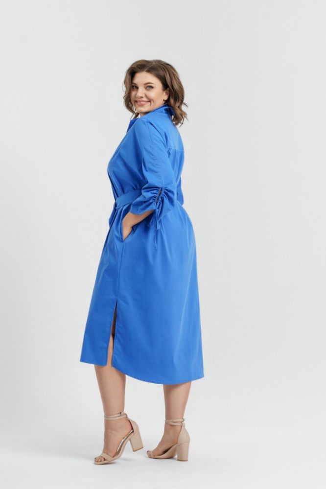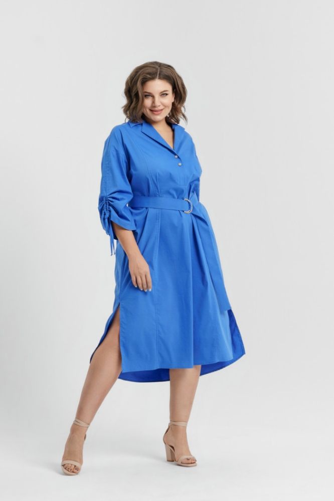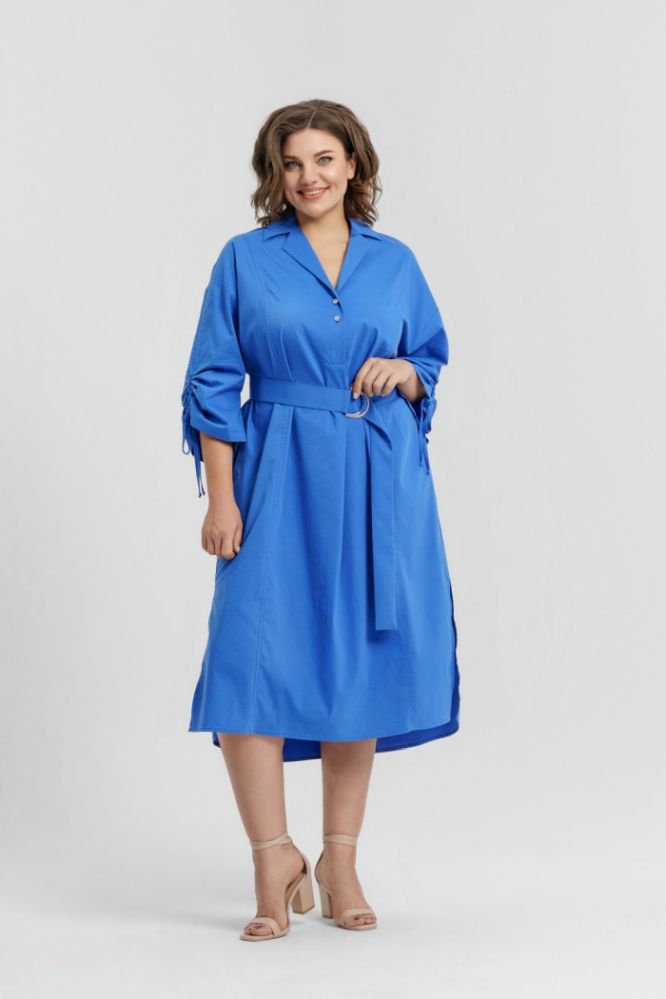 Платье женское свободного силуэта из хлопковой ткани. Воротник отложной с лацканами, застежка на петли и пуговицы до линии талии. Рукава отрезные на базе спущенного, присборены к низу.