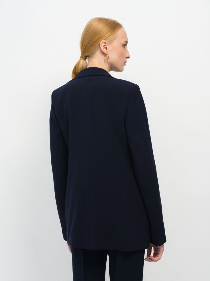 Детали | С длинным рукавом, воротником и лацканами. На подкладке с застежкой на одну пуговицу. Боковые прорезные карманы в «рамку» с клапанами. Край борта закруглен.
