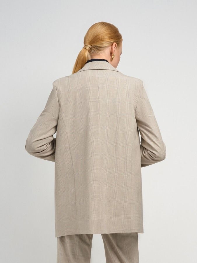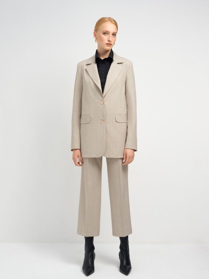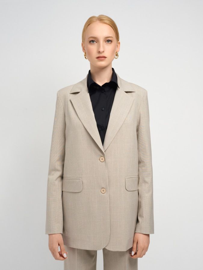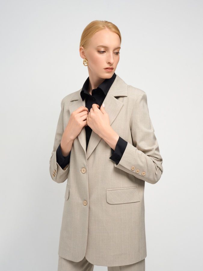 Детали | С длинным рукавом, воротником и лацканами. На подкладке, с застежкой на две пуговицы. Боковые карманы с клапаном. Край борта закруглен. На рукавах шлицы.