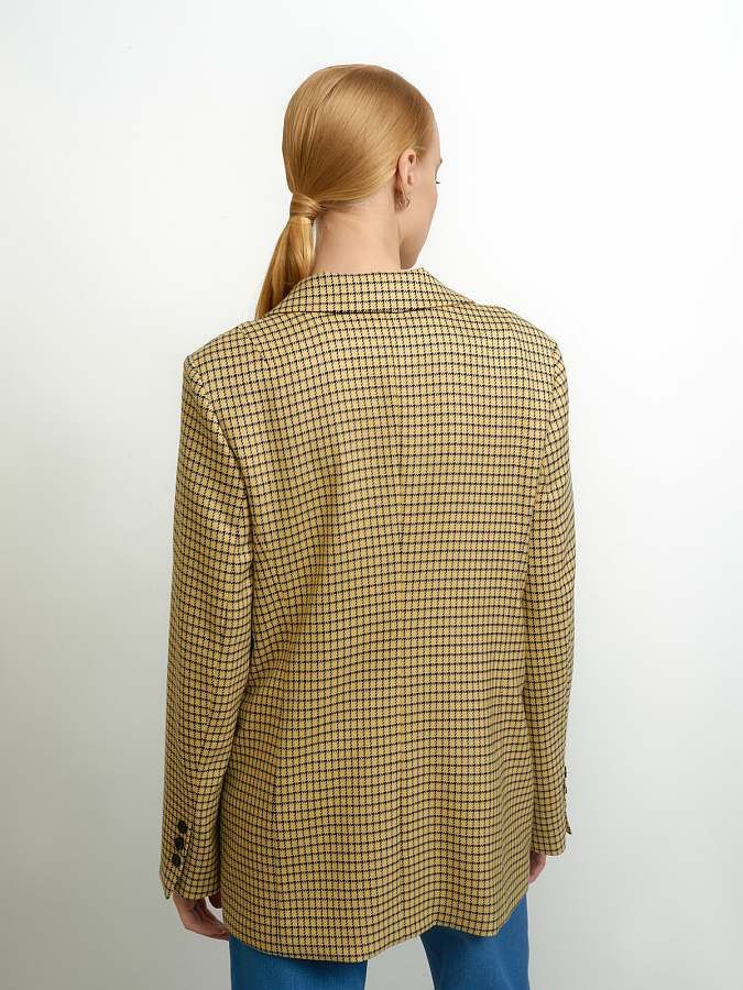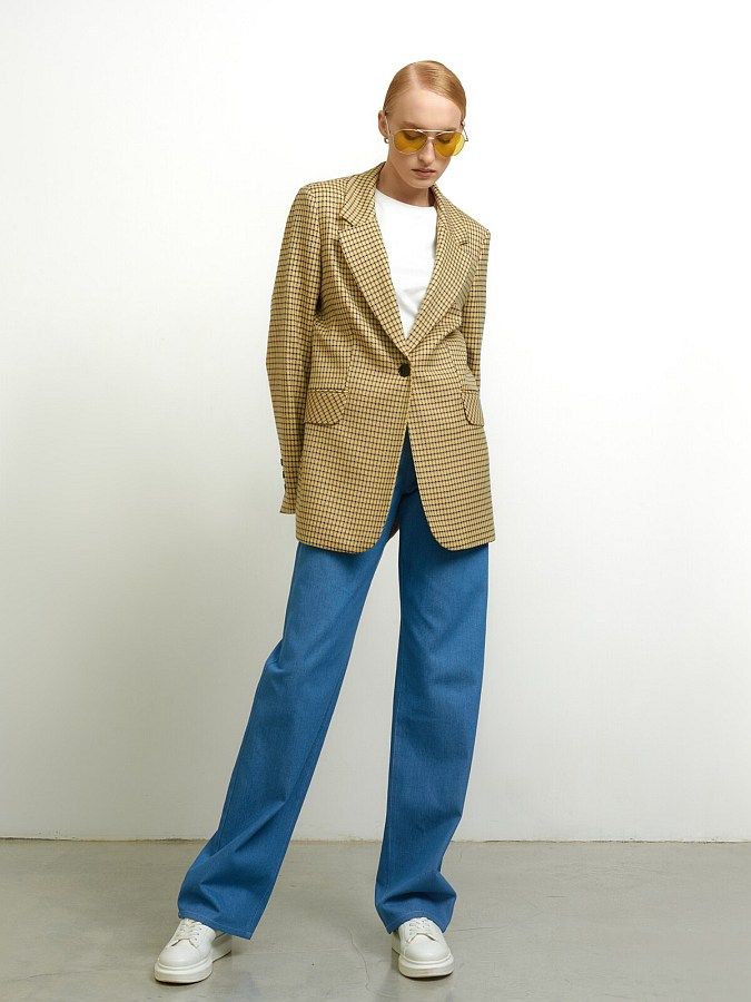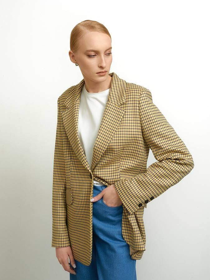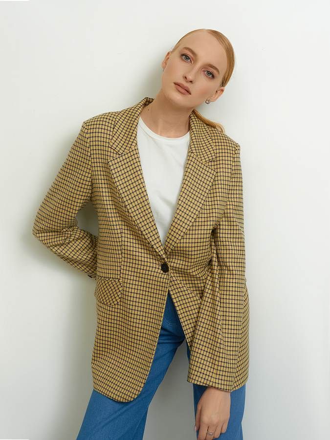 Однобортный, с длинным рукавом, с воротником и лацканами. На подкладке, с застежкой на две пуговицы. Боковые прорезные карманы в «рамку» с клапанами.