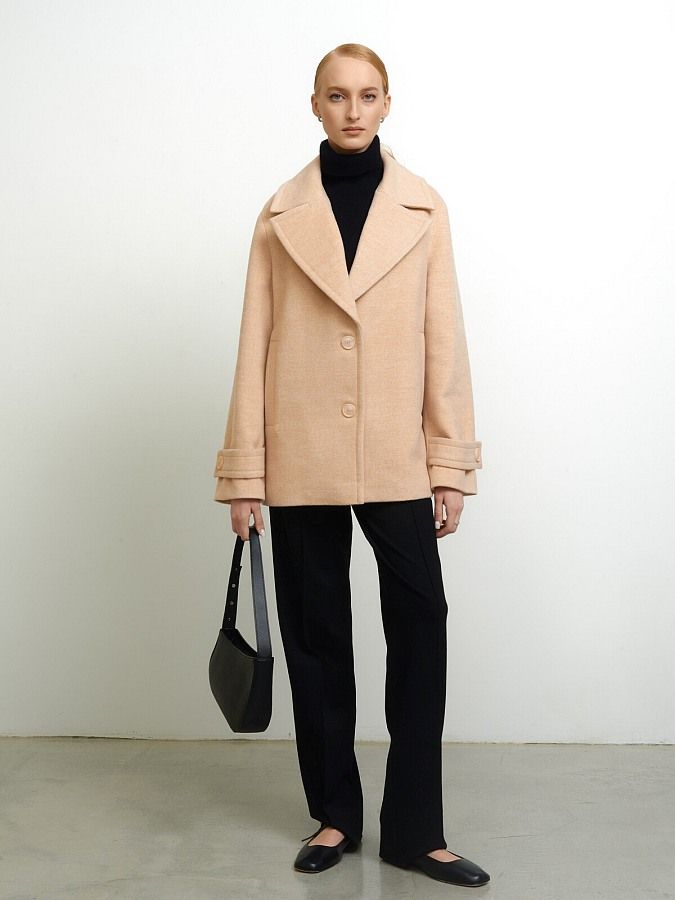 Однобортное, с длинным рукавом и спущенным плечом, с воротником и лацканами. На подкладке, с застежкой на 2 пуговицы. По низу рукава пата. Карманы прорезные, с вертикальной листочкой на полочке.