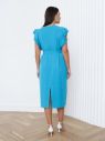 Платье прямого силуэта с двойными воланами на плечах. V-образная горловина. В среднем шве спинки разрез. На талии завязывается мягкий пояс. Длина миди.
