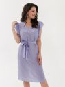 Платье прямого силуэта с двойными воланами на плечах. V-образная горловина. В среднем шве спинки разрез. На талии завязывается мягкий пояс. Длина миди.