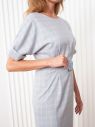 Платье офисное. Материал - костюмная мягкая ткань в нежную клетку. Полуприлегающий силуэт. Спереди округлая горловина, на спинке V-образный вырез с пуговицами. Рукава кимоно с отворотами. На талии пояс с пряжкой. Разрез в среднем шве спинки. Длина модели миди.