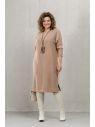 Платье женское свободного покроя из мягкого трикотажного полотна. Вырез горловины неглубокий округлой формы. В боковых швах функциональные карманы, по низу разрезы.
