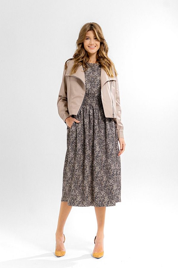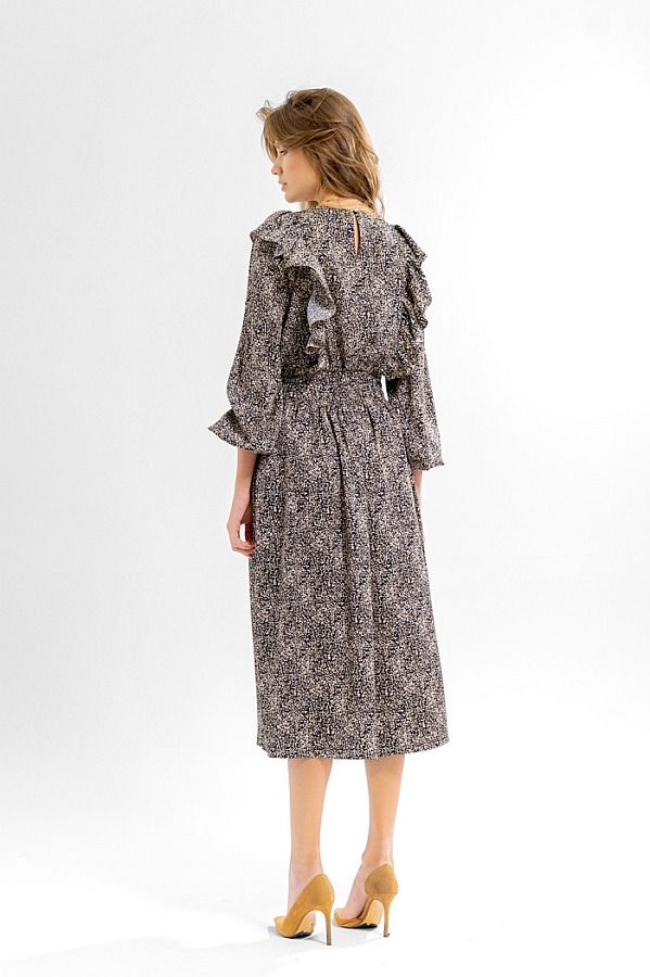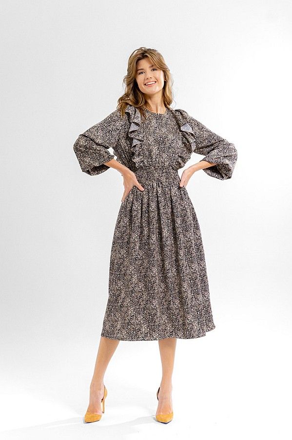 Платье женское свободного покроя. Горловина округлой формы. Рукав втачной, по низу присборен на эластичную тесьму. По переду и спинке в рельефах вставлен волан со сборкой. По линии талии отрезное, присбореное на резинку-венгерку. В боковых швах функциональные карманы.