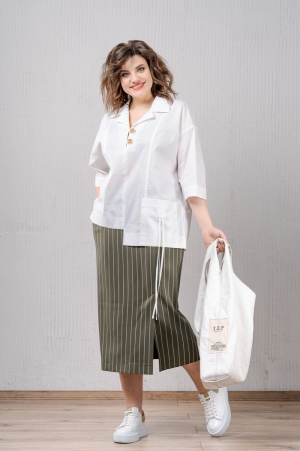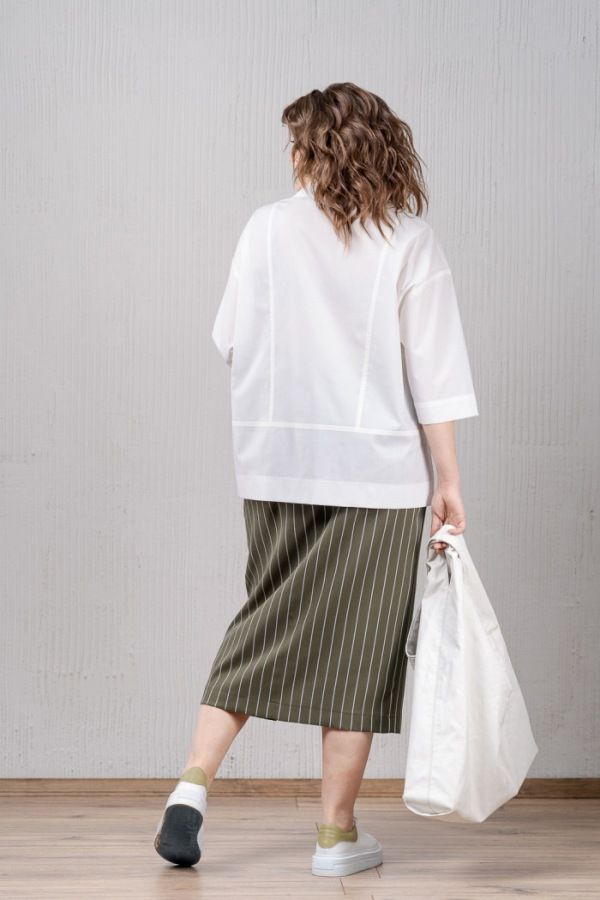Юбка прямого силуэта в полоску без подкладки, со шлицей по переду в рельефе. В боковых швах имеются карманы с отрезными бочками, на задней части шов с застежкой на потайную молнию. Пояс- отрезной с эластичной тесьмой и застежкой на петлю и пуговицу.