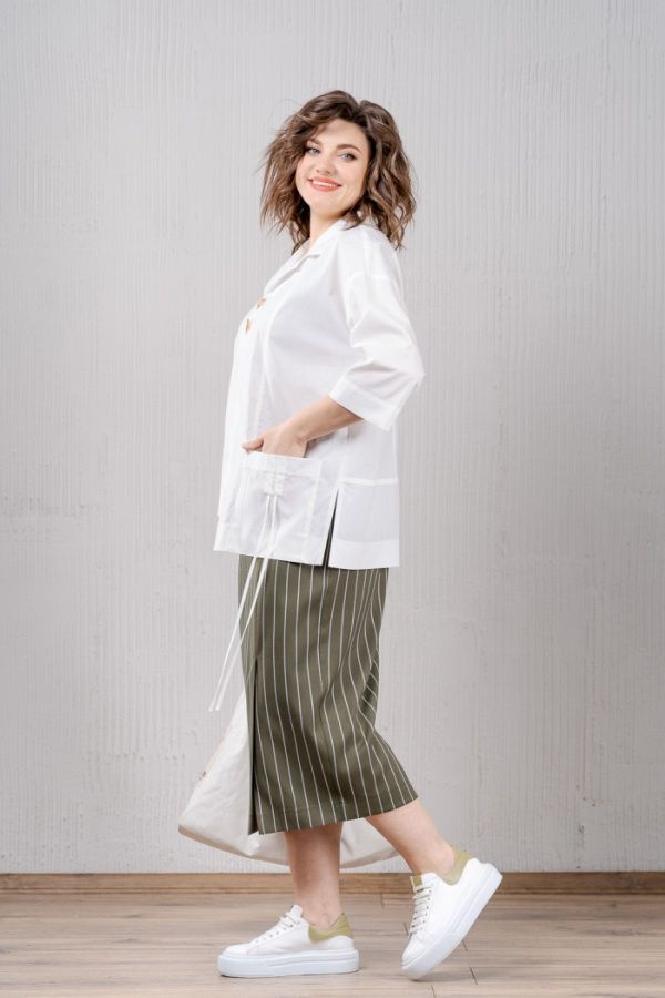 Рубашка свободного покроя из хлопка со спущенной проймой. Вырез горловины V-образной формы с отложным воротником и застежкой до груди на две петли и пуговицы. Рукава на базе цельнокроеных. Низ асимметричный, левая часть переда длиннее правой, по боковым швам разрезы. По левой половинке переда накладной карман с кулисой и декоративными шнурами.