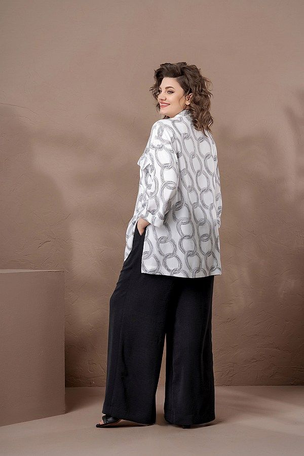 Брюки- свободного покроя, прямые от бедра. В боковых швах имеются карманы с отрезными бочками. Пояс- отрезной с эластичной тесьмой, застежка - молния.