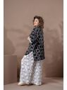 Брюки- свободного покроя, прямые от бедра. В боковых швах имеются карманы с отрезными бочками. Пояс отрезной с эластичной тесьмой, застежка - молния.