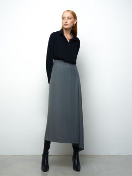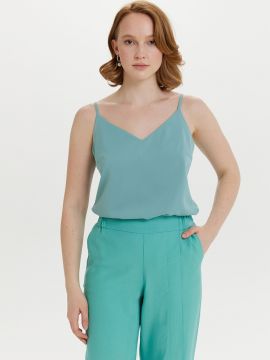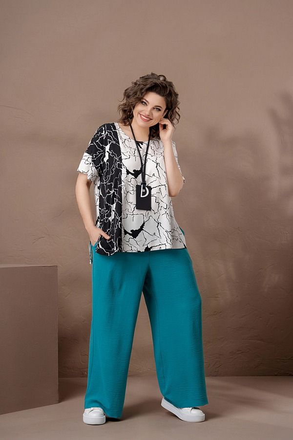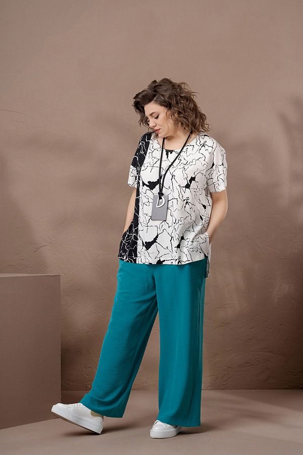 Блуза свободного покроя из легкой вискозной ткани двух цветов. Вырез горловины неглубокий округлой формы. Рукав на базе цельнокроеного, короткий. Низ асимметричный, в боковых швах разрезы.