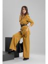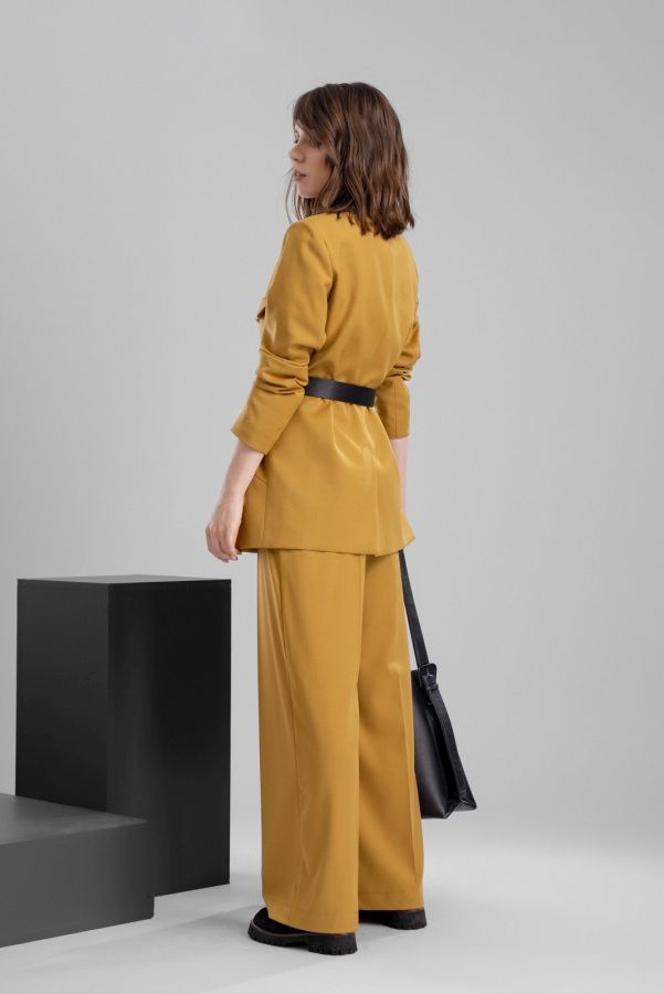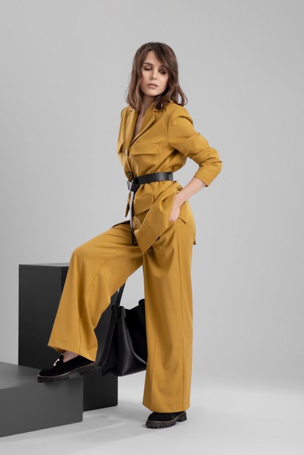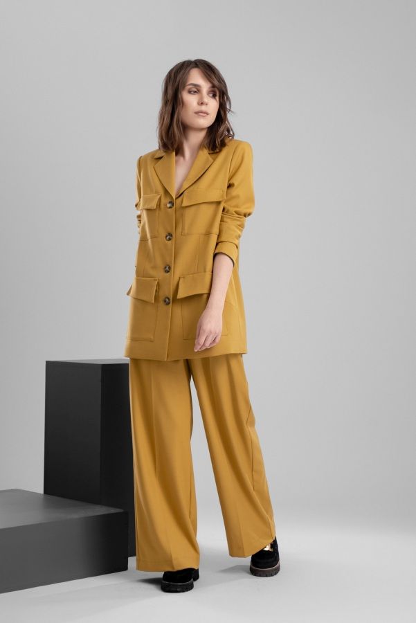 Комплект женский двухпредметный. Жакет однобортный прямого покроя на подкладке. Перед с четырьмя накладными карманами с клапанами. Рукав втачной, на спинке шлица. Застежка на петли и пуговицы.