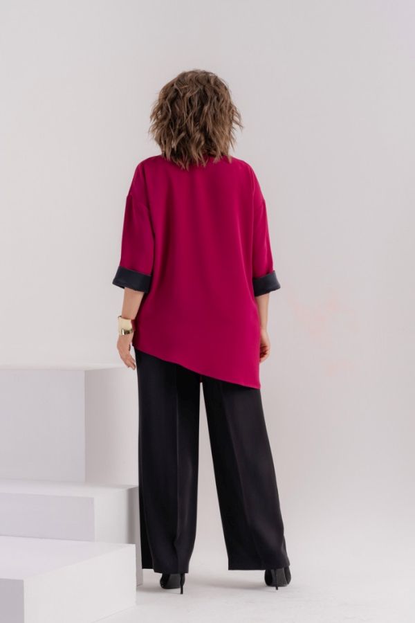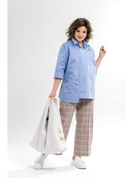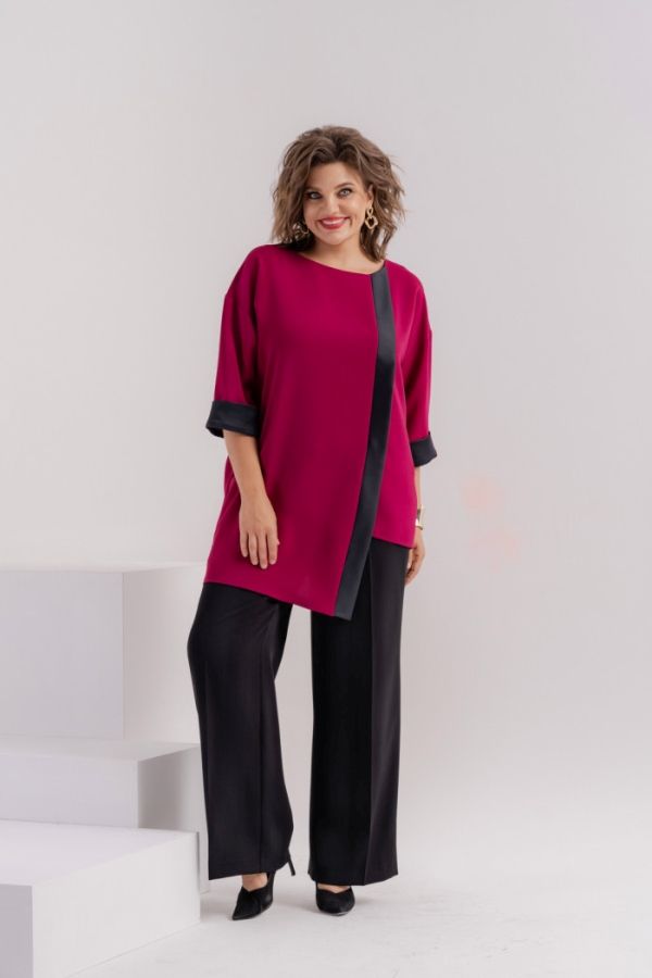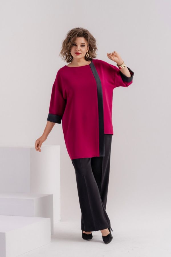 Туника свободного покроя. Вырез горловины не глубокий, округлой формы. Рукав отрезной на базе цельнокроеного, по низу манжет. По переду декоративный подрез с вставкой из отделочной ткани. Низ асимметричный.