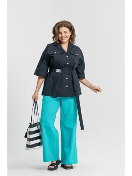 Брюки - свободного покроя, прямые от бедра. В боковых швах карманы с отрезными бочками. Пояс - отрезной с эластичной тесьмой.