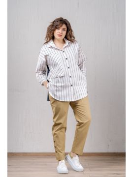Брюки - свободного покроя, прямые от бедра. Пояс - отрезной с эластичной тесьмой, карманы с отрезным бочком.