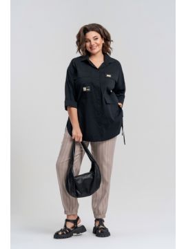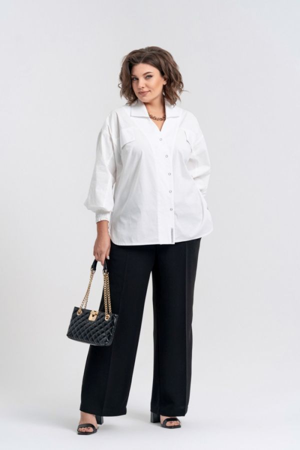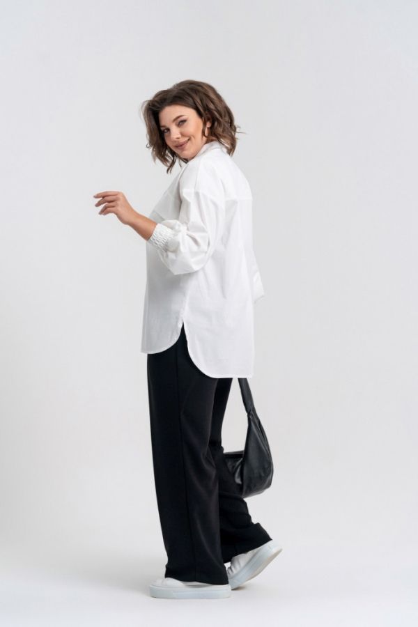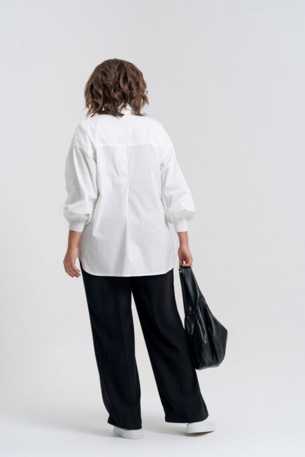 Блуза из хлопковой ткани свободного силуэта. Воротник отложной, рукава отрезные на базе цельнокроеного, по низу широкий манжет собраный на венгерку. Застежка на декоративные кнопки. В боковых швах разрезы. На спинке кокетка, складка.