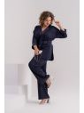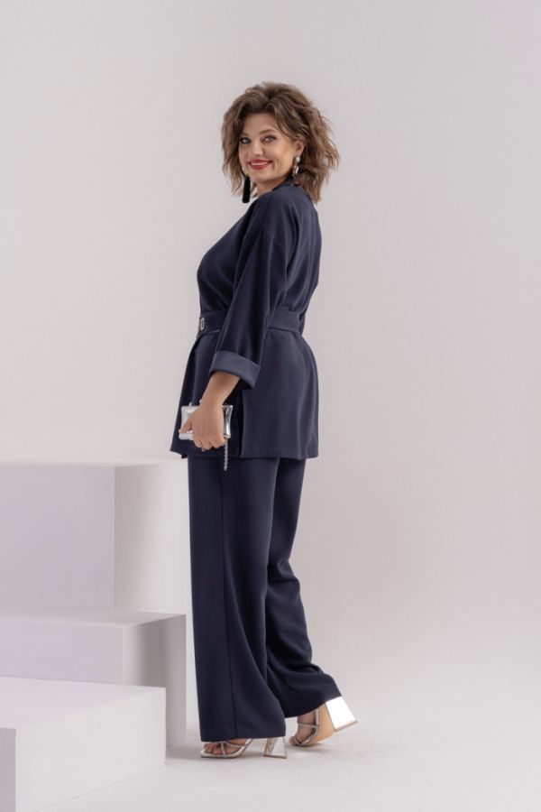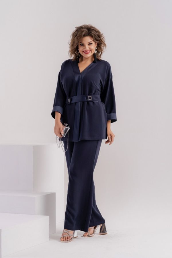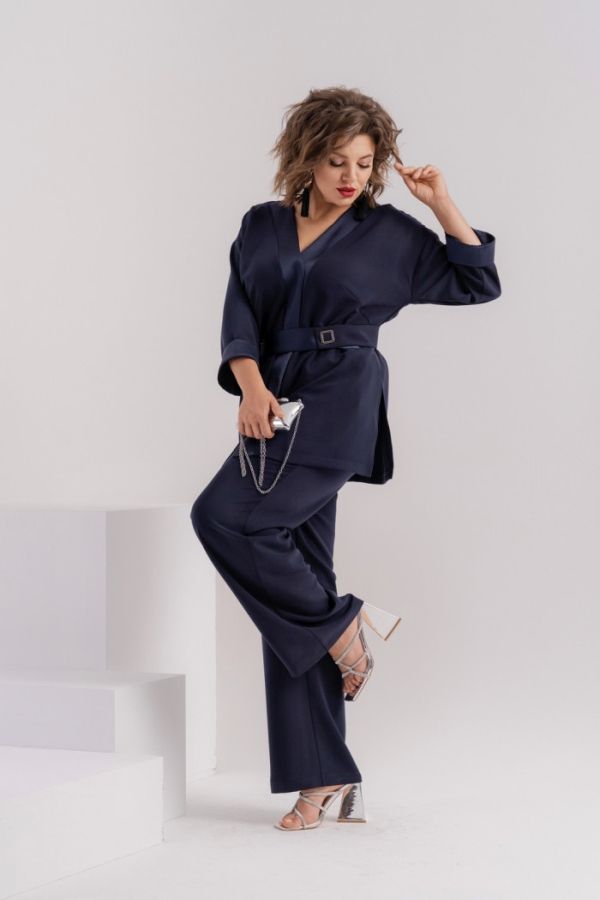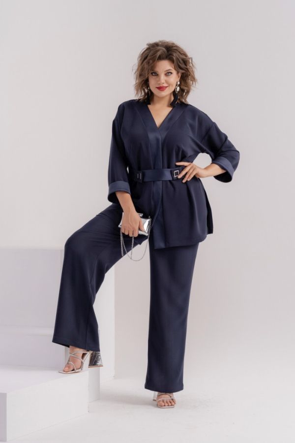 Изделие дополнено съемным поясом из основной ткани на декоративных кнопках. По переду планки, манжеты и частично пояс выполнены из отделочной атласной ткани в тон комплекта.