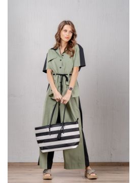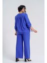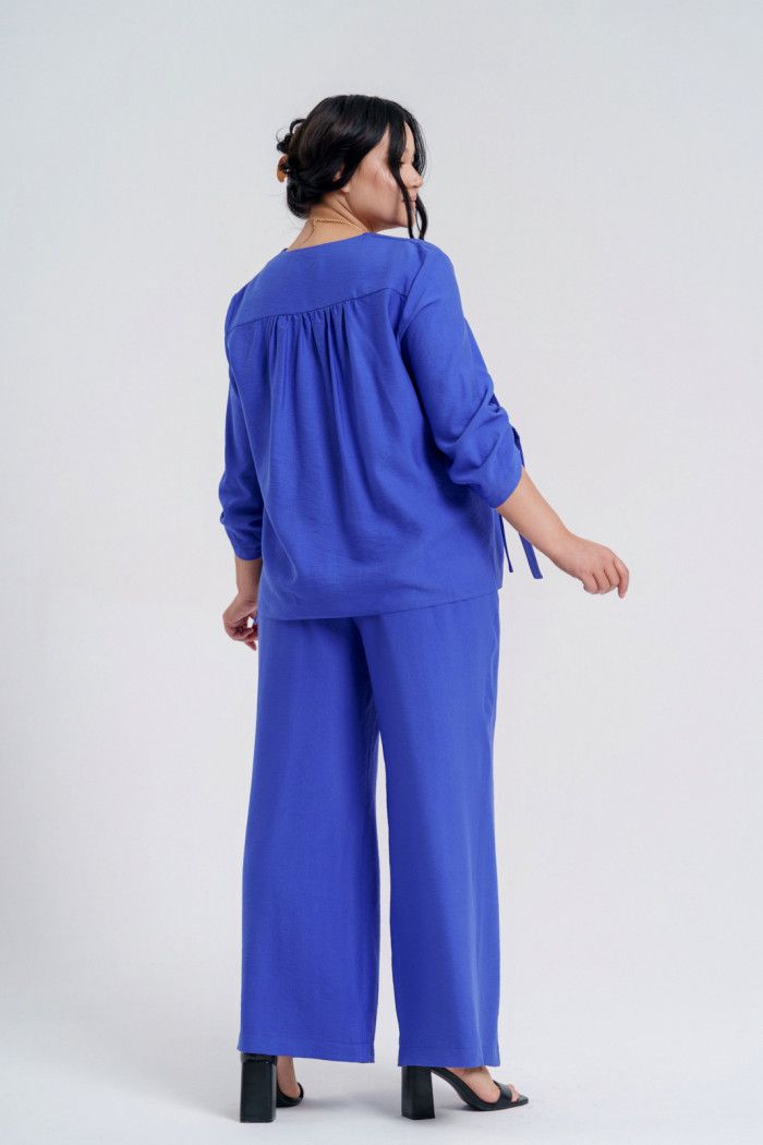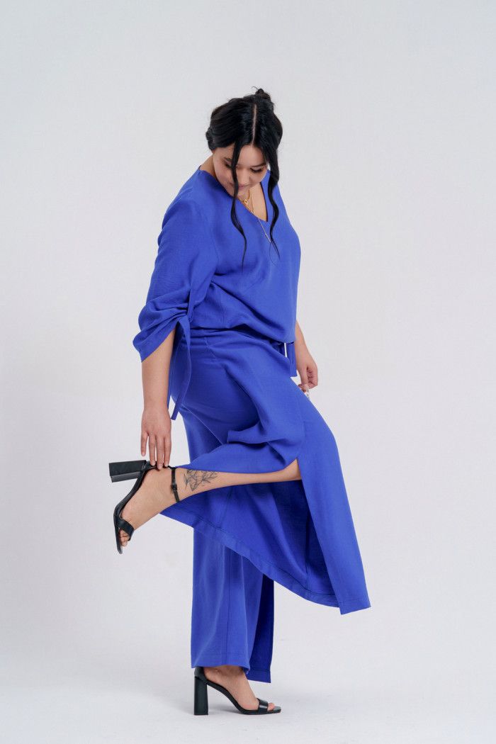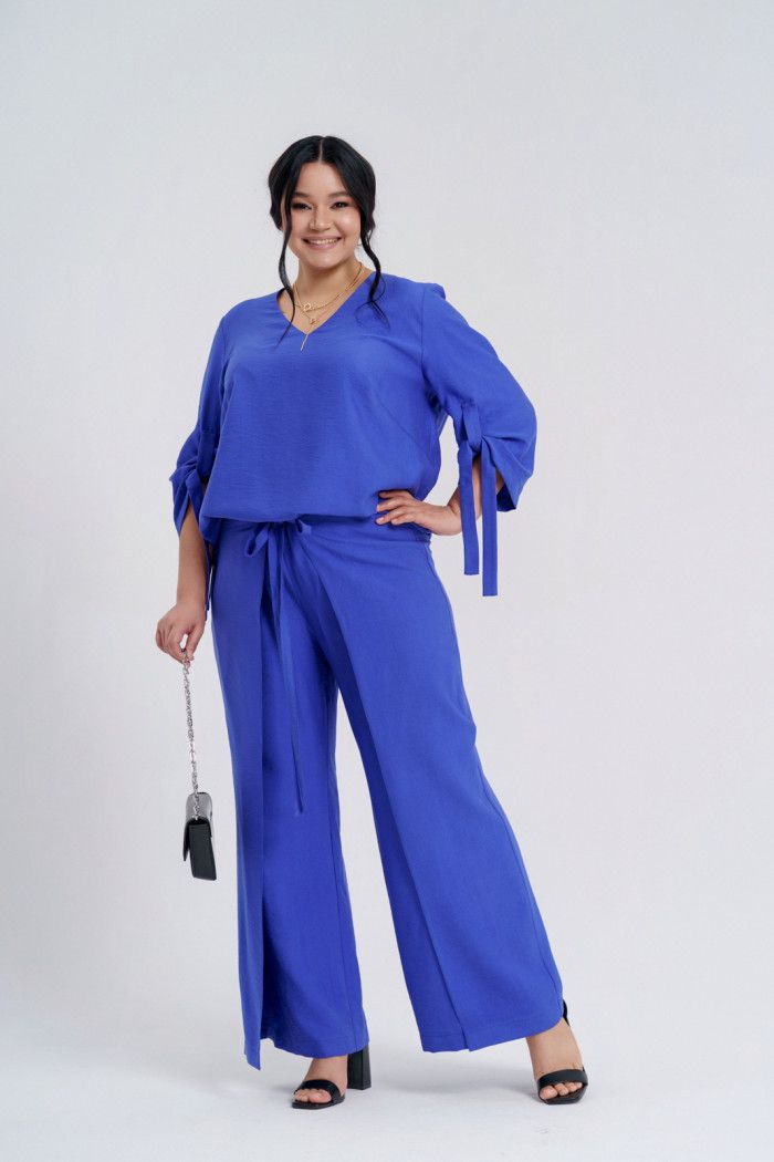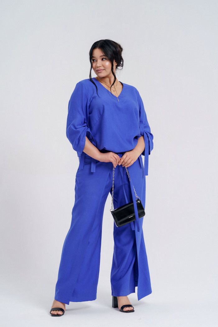 Брюки свободного покроя, прямые от бедра с запахами от боковых на завязку. В боковых швах высокие разрезы. Пояс- отрезной с эластичной тесьмой.