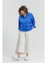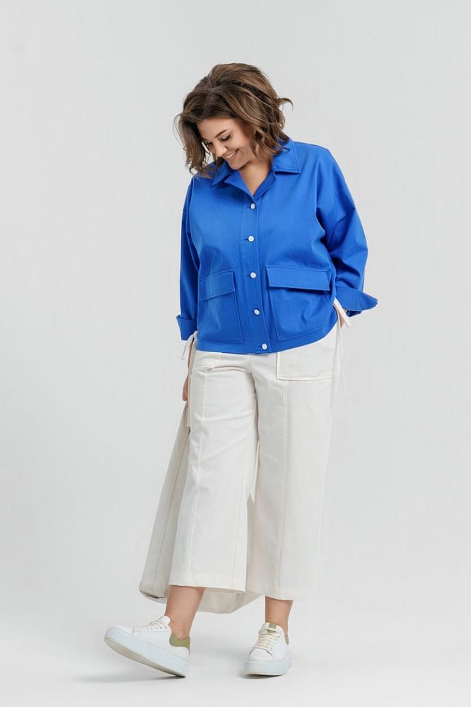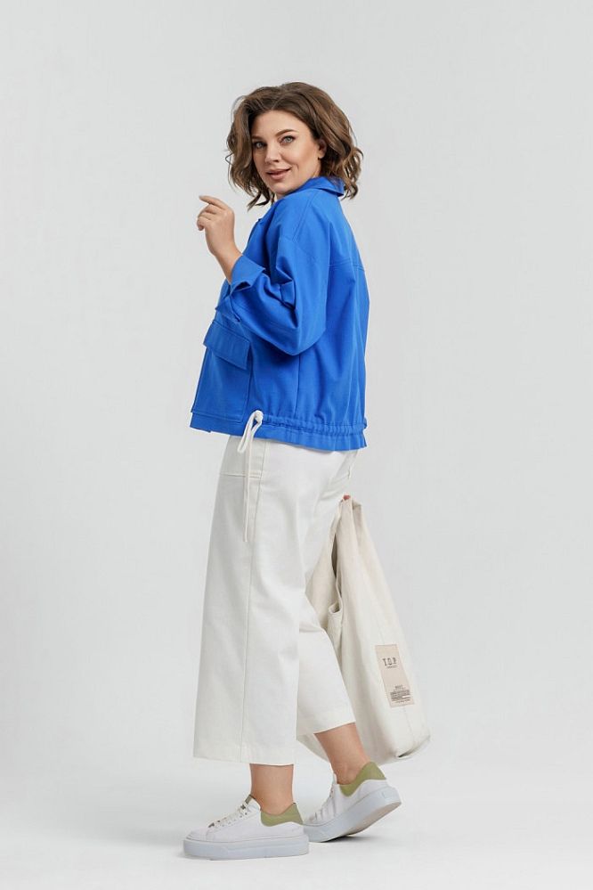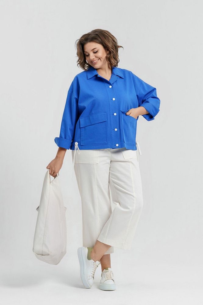 Жакет -джуд прямого силуэта без подкладки из джинсовой ткани. Отложной воротник, застежка- планка на петли и пуговицы.
