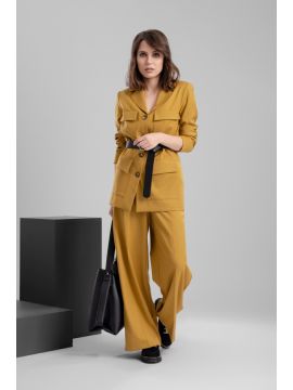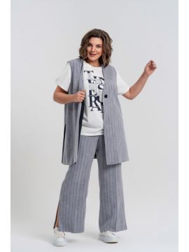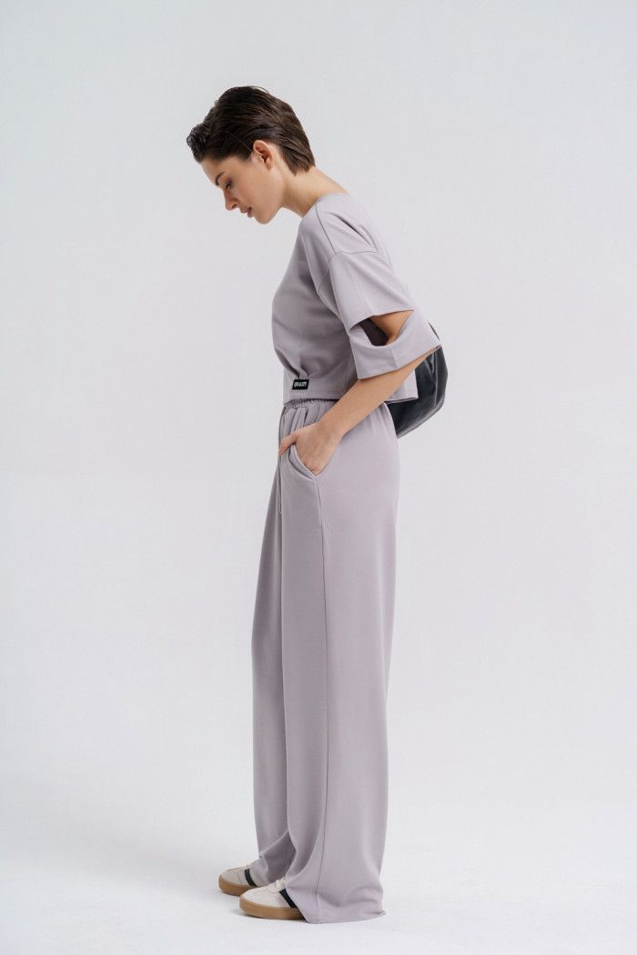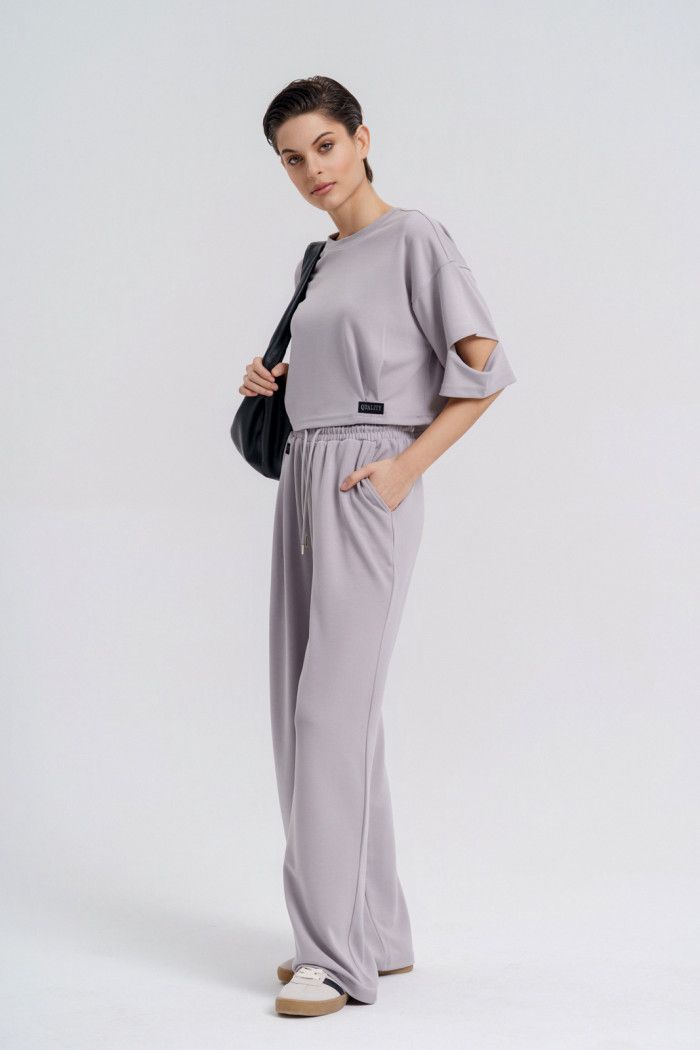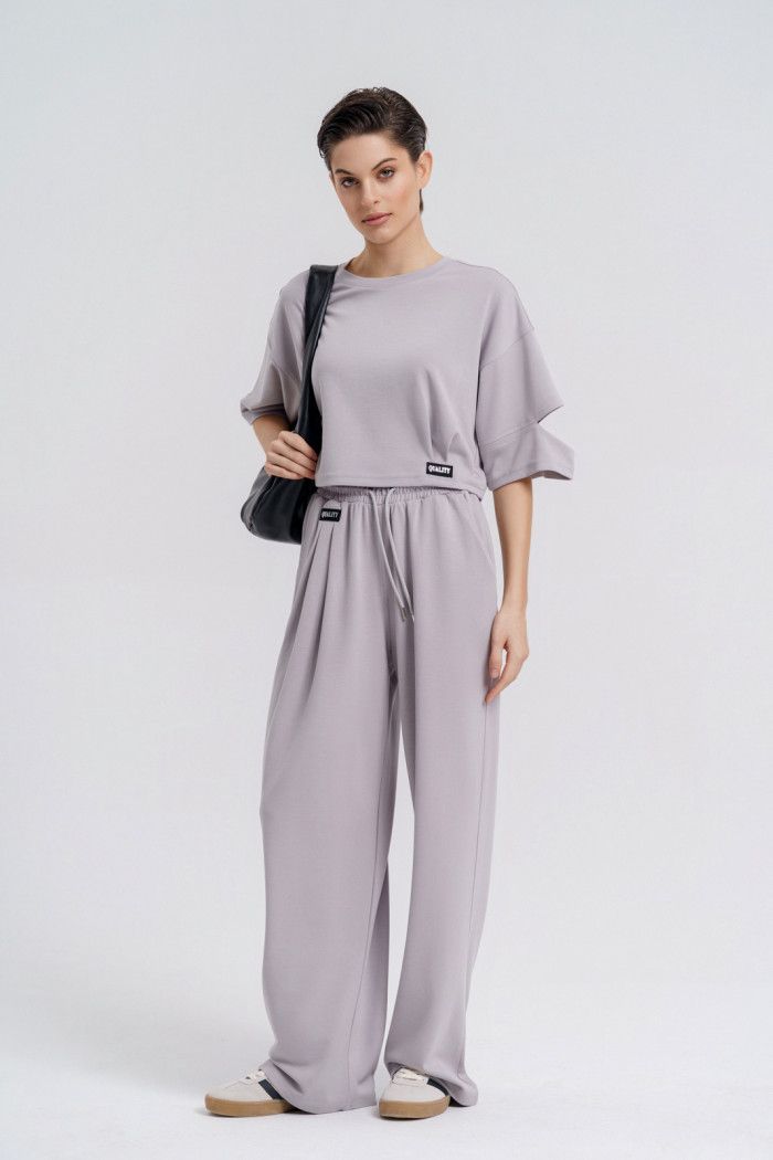 Брюки свободные прямого кроя. Эластичный пояс c регулируемыми шнурками. Боковые карманы. Комплект декорирован нашивками.