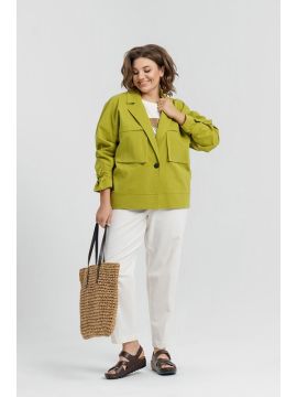 Блуза свободного покроя из легкой вискозной ткани. Вырез неглубокий окрулой формы, рукав цельнокроеный короткий с манжетом. По переду накладной карман из принтованой ткани. В боковых швах разрезы.