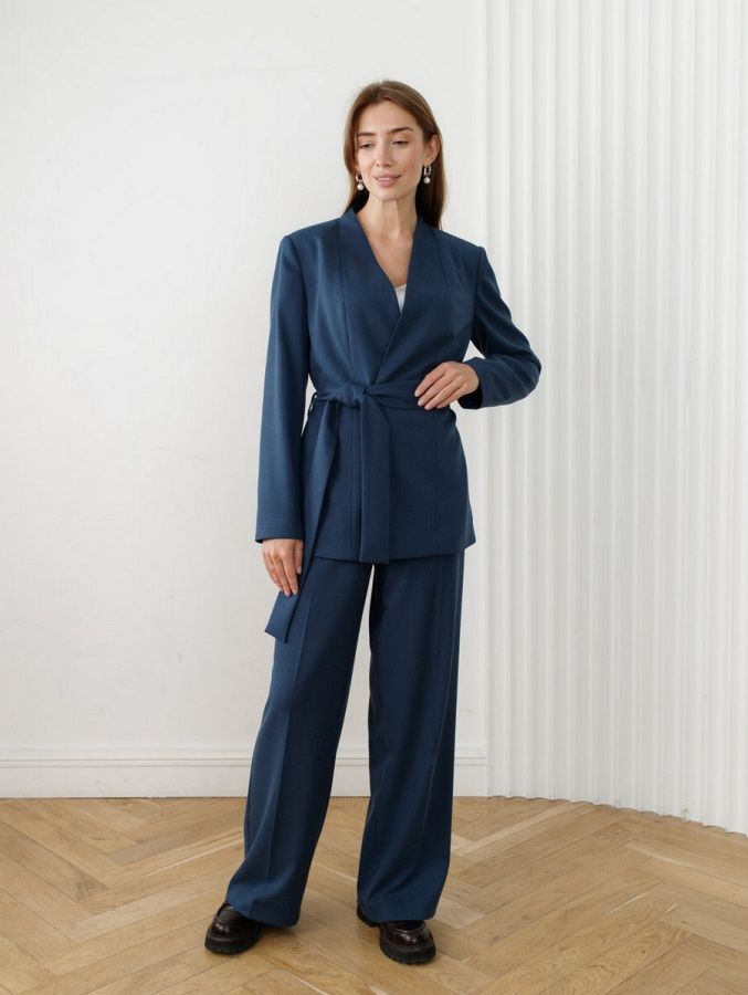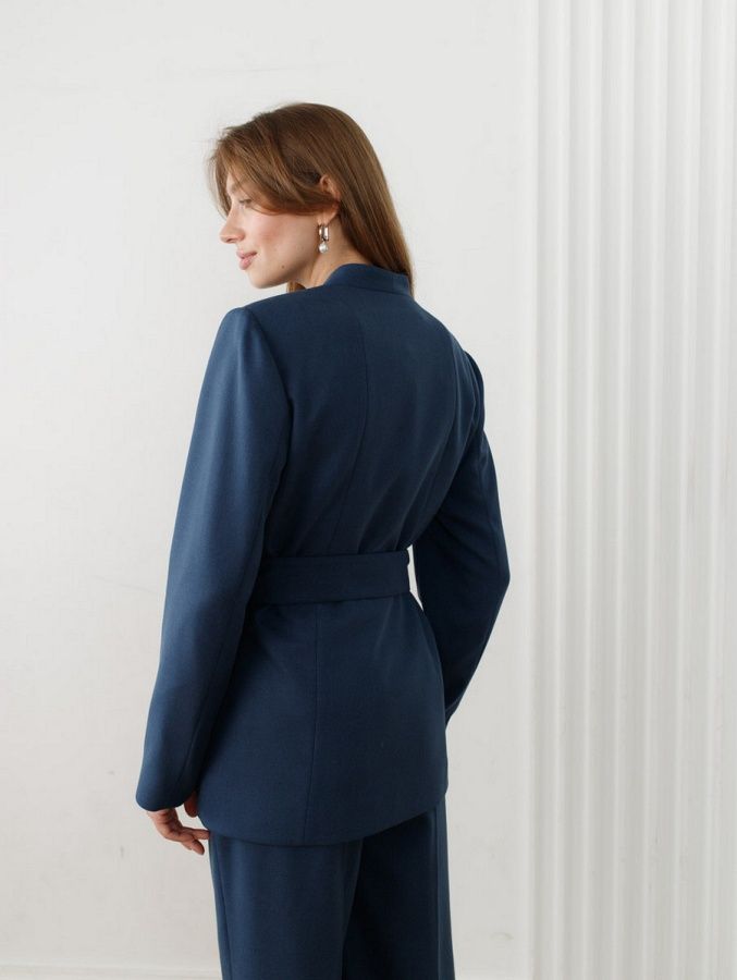 Жакет из костюмной ткани. Полуприлегающий силуэт. Рельефные швы на полочке и спинке. На талии пояс. Жакет на подкладке. Застёжка на потайные кнопки. Длина до линии бёдер.