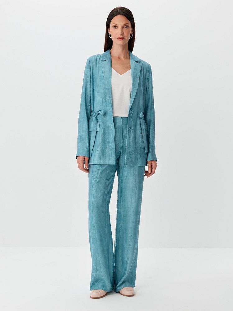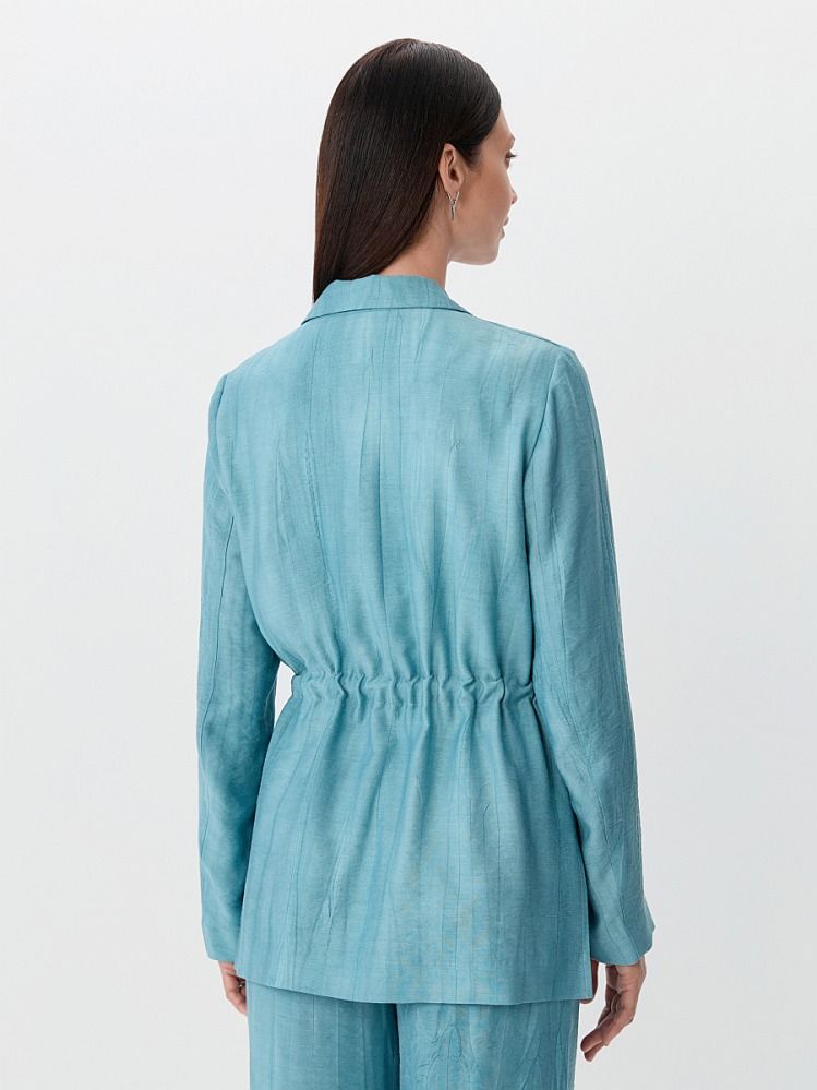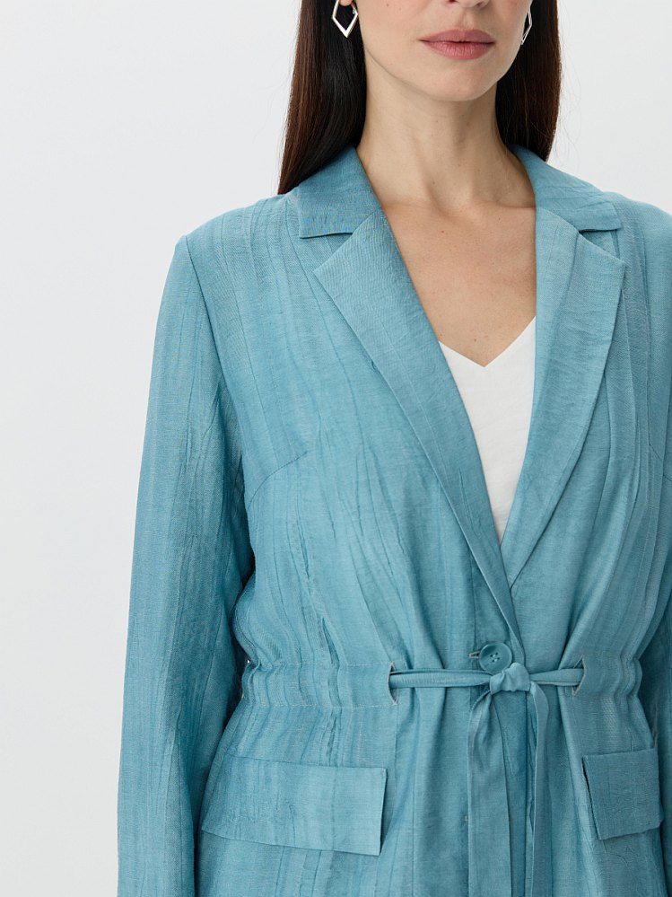 Жакет прямого силуэта с однобортной застёжкой выполнен из тактильно приятной ткани на основе тенселя, конопли и вискозы — натурального и экологичного материала с лёгкой фактурной поверхностью, имитирующей крэш-эффект. Это идеальное сочетание для комфортной носки в тёплое время года. Жакет без подкладки -комфортное решение для весенне-летнего сезона. Элегантный английский воротник, втачные рукава полной длины и разрезы в боковых швах обеспечивают свободу движений и подчеркивают лаконичный силуэт. Пояс-кулиска акцентирует талию, придавая образу женственность и мягкую структуру — отличительная черта жакетов с поясом. Особую выразительность модели придаёт уникальный градиент цвета морской волны — свежий и стильный вариант для весенне-летнего гардероба. Жакет отлично сочетается с брюками (2.5.2-115) и (2.5.2-285), создавая лёгкий и модный женский костюм в духе современной естественности и экологичного подхода к стилю.