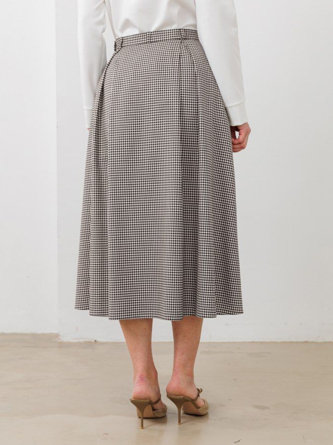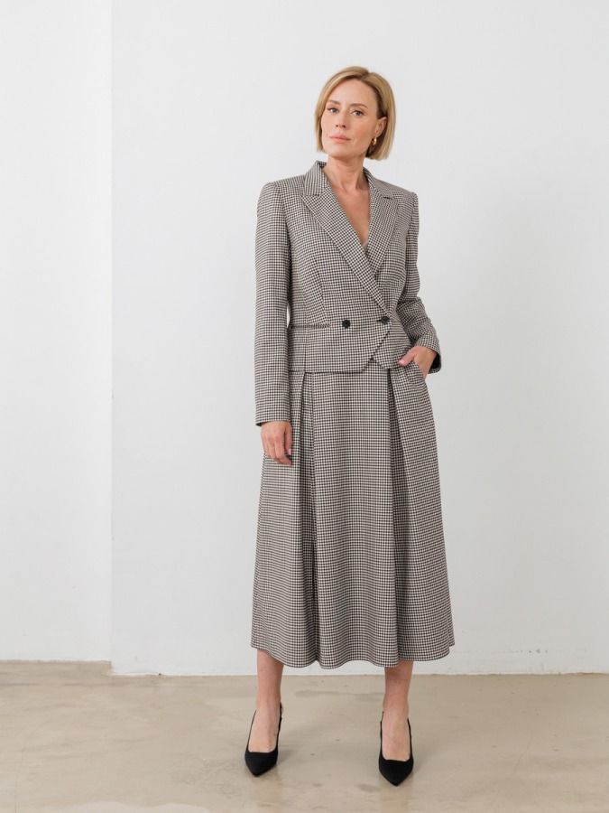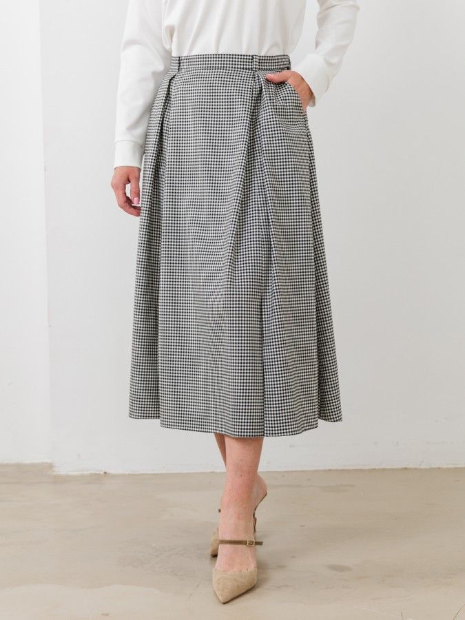 Юбка длины миди трапецевидного силуэта. Встречные складки с кокетливыми разрезами впереди, функциональные карманы, комфортный пояс. Нити люрекса, интегрированные в черно-молочную гамму придают деликатную изысканность костюмной ткани с принтом виши, из которой выполнено изделие.