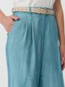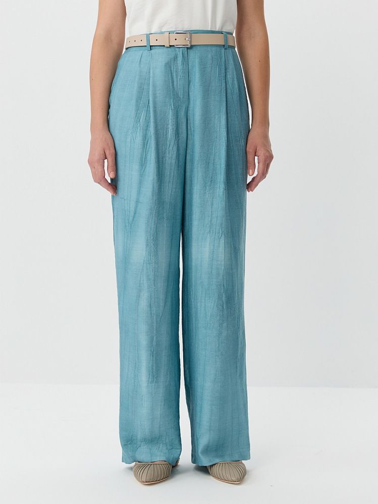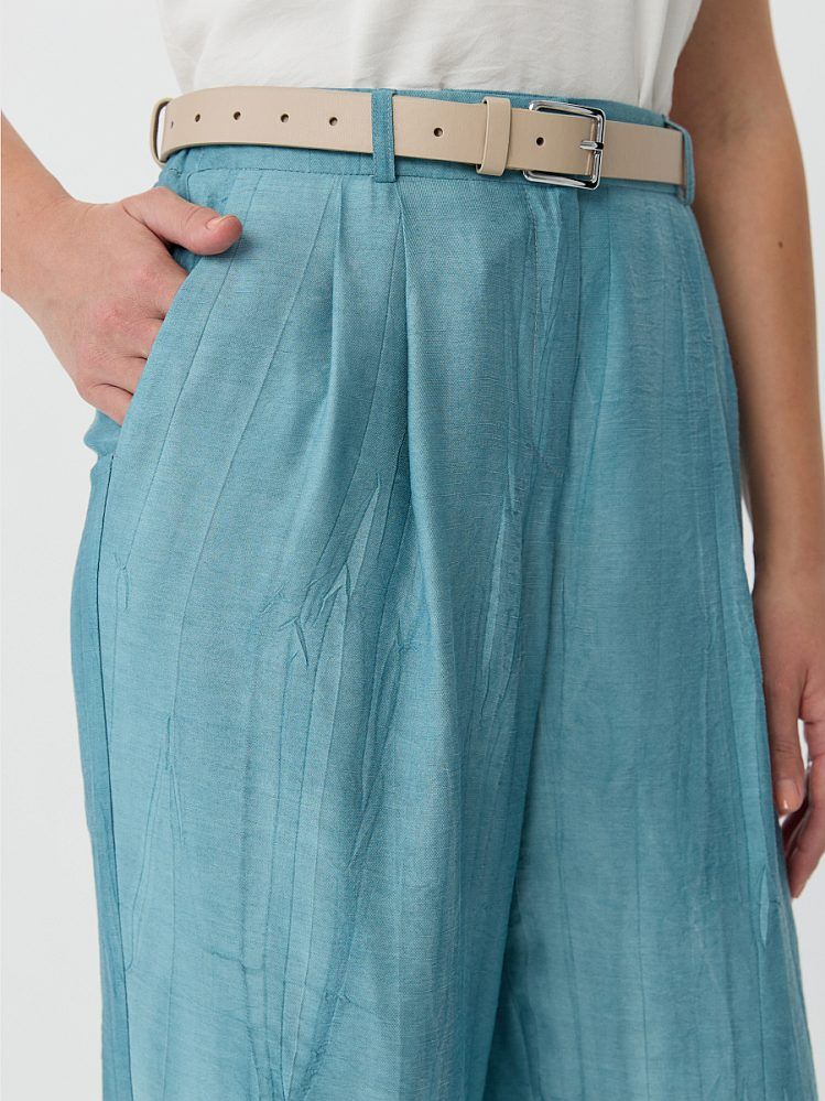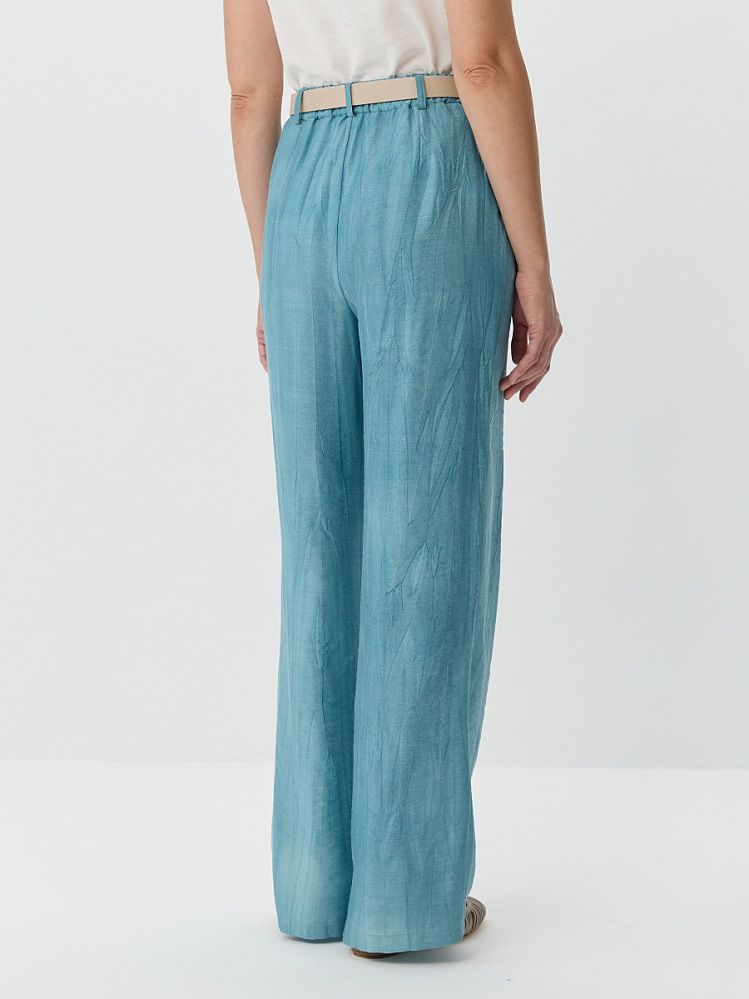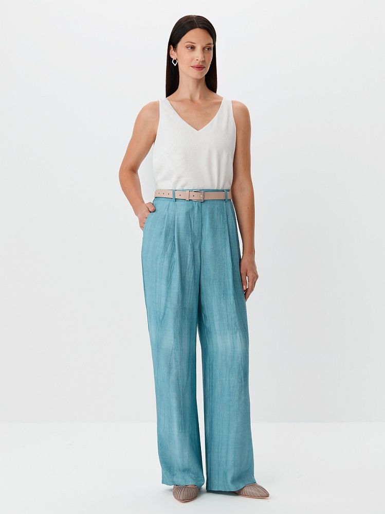 Брюки прямого силуэта с мягкими защипами у пояса выполнены из комфортной ткани на основе тенселя, вискозы и конопли — натурального материала с фактурной поверхностью, имитирующей крэш-эффект. Лёгкие, дышащие и идеально подходящие для тёплого сезона. Пояс со шлёвками, резинка по талии сзади и боковые карманы обеспечивают удобную посадку и функциональность. Полная длина и свободный крой делают эту модель универсальной для повседневной носки, офиса и прогулок. Особую выразительность брюкам придаёт градиент морской волны — нежный, переходящий оттенок, добавляющий образу свежести и индивидуальности. Эти брюки из тенселя, вискозы и конопли идеально сочетаются с жакетом (2.3.3-902), формируя стильный и гармоничный женский костюм в трендовой природной палитре.