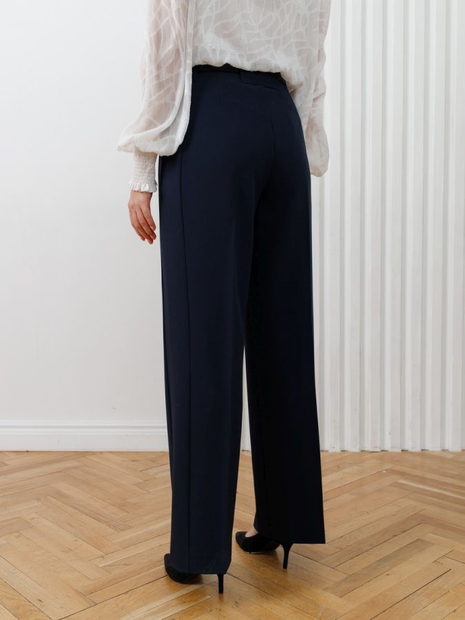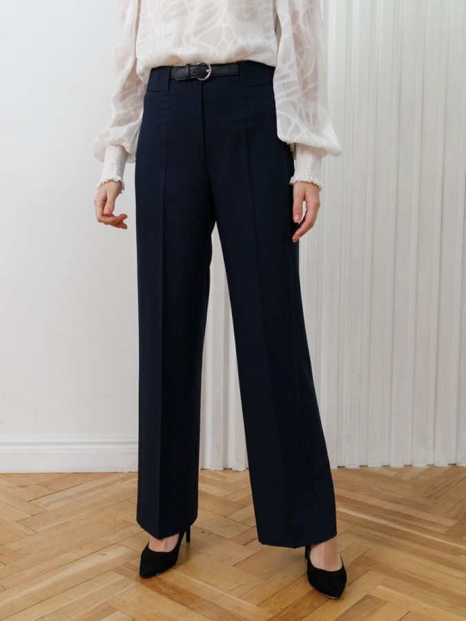 Брюки прямого силуэта. Материал-костюмная ткань с эластаном. Прямой крой. Длина в пол. Пояс со шлёвками разной ширины. Брюки без бокового шва, с широкой боковой вставкой. Застёжка на молнию и крючок.