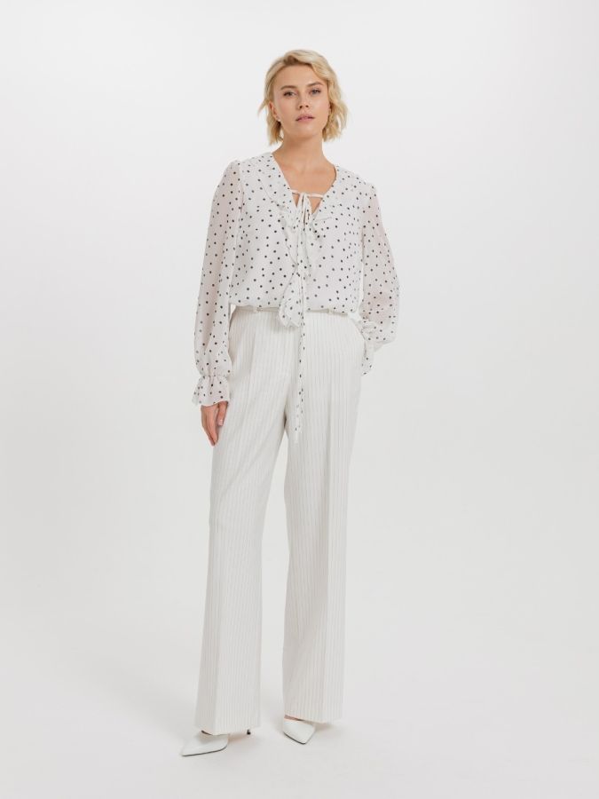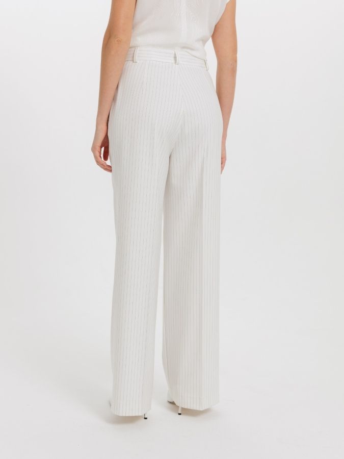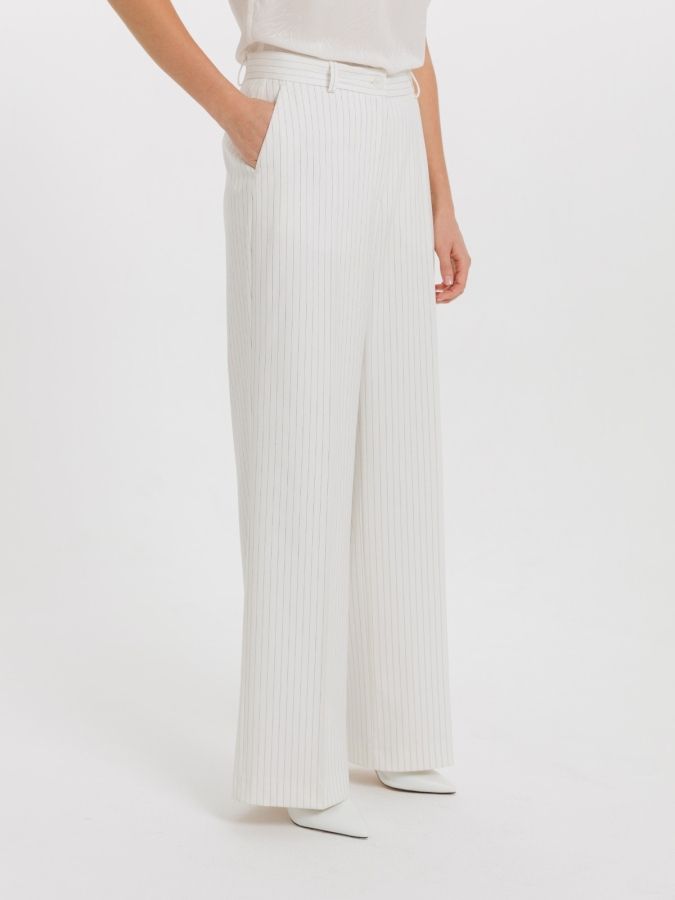 Роскошная классика в стилистике Old money. Брюки комфортной средней посадки, прямого силуэта. Модель выполнена из несминаемой, тактильно приятной костюмной ткани белого цвета с принтом полоска. В капсульной коллекции комбинируются в костюм-тройка с жилетом 2.9.3-415 и жакетом 2.3.3-860.
