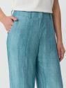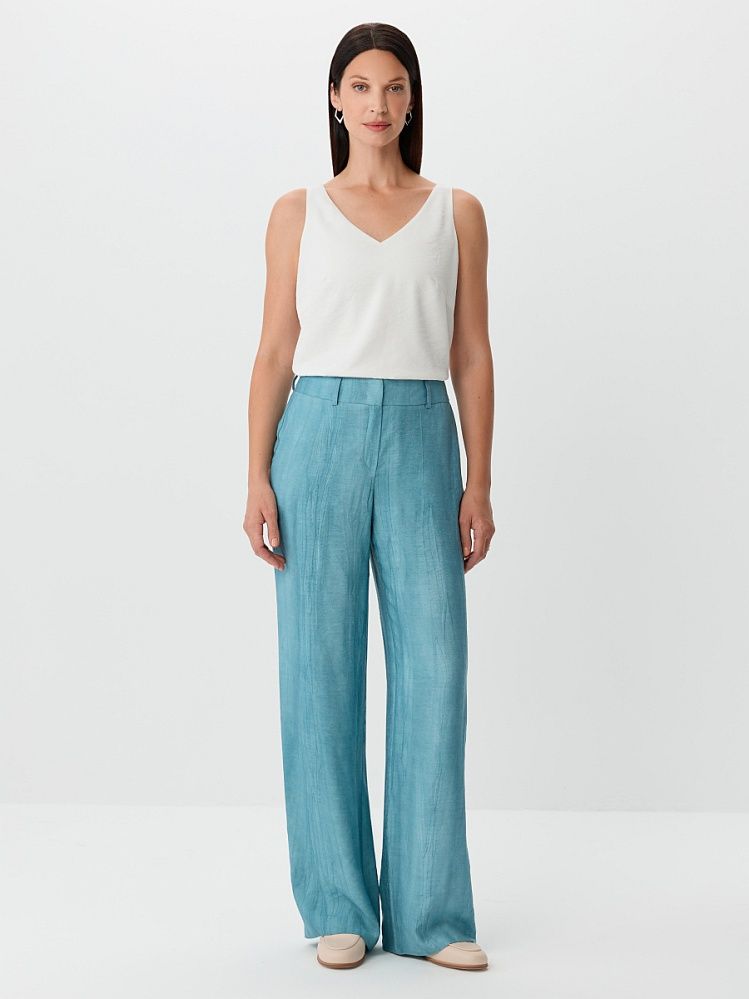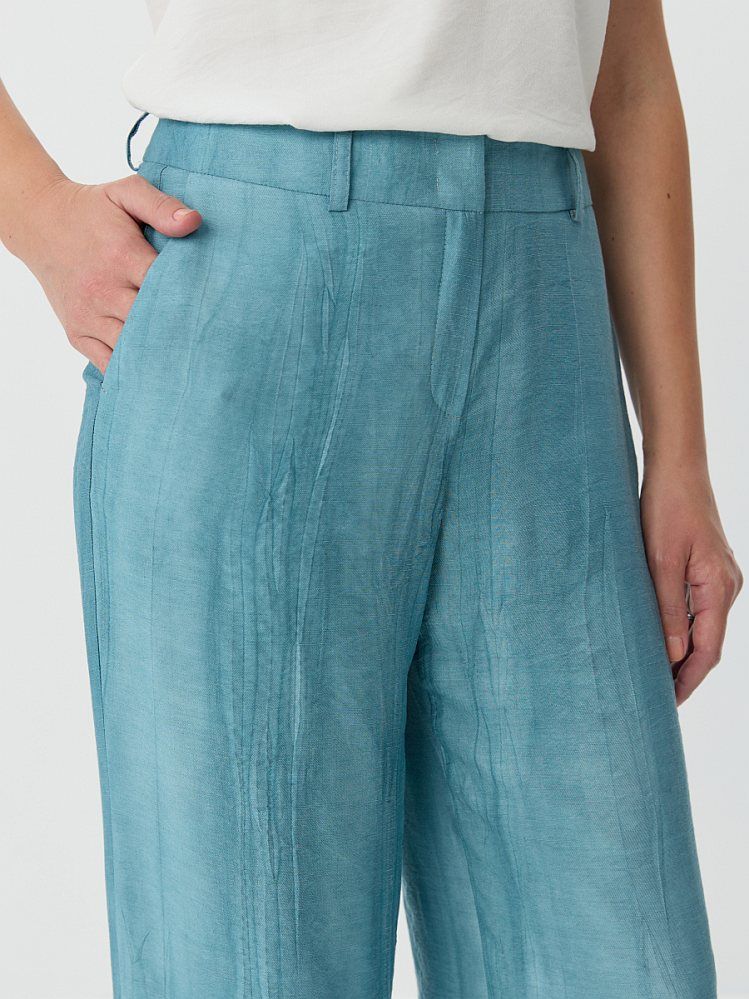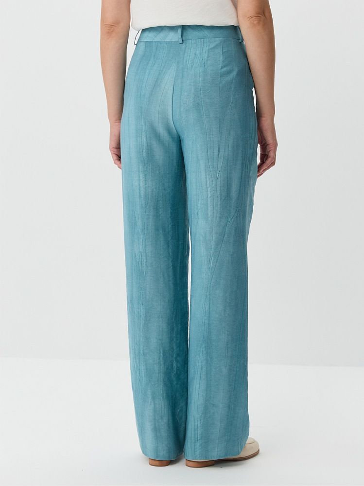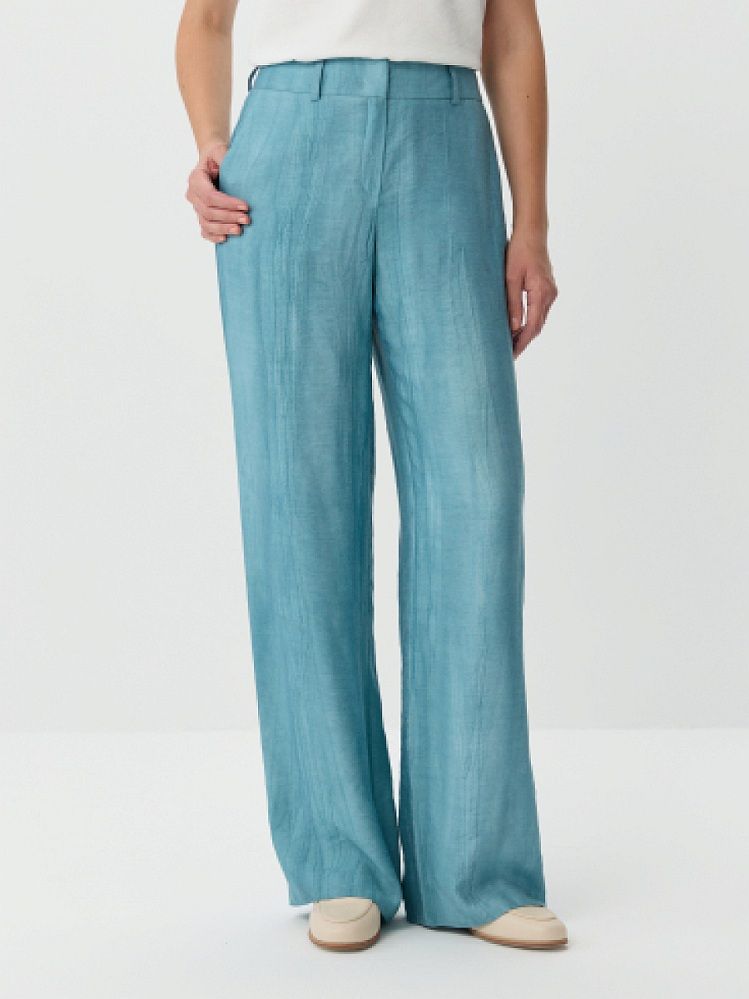 Брюки прямого силуэта с комфортной средней посадкой выполнены из натуральной ткани на основе тенселя, вискозы и конопли. Лёгкая фактура с эффектом крэш придаёт модели характер и подчёркивает природную эстетику. Мягкий материал обеспечивает свободу движений и ощущение комфорта в течение всего дня — идеальный выбор для повседневной носки в тёплое время года. Основной акцент модели — нежный градиент цвета морской волны, придающий образу свежесть и индивидуальность. Это решение выделяет брюки среди классических моделей и делает их актуальными для летнего гардероба. Модель прекрасно сочетается с жакетом (2.3.3-902), формируя стильный и сбалансированный женский костюм в природной цветовой палитре.