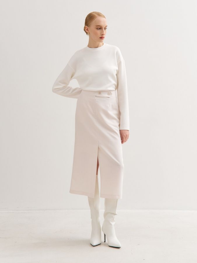 Детали | На подкладке. С двумя шлицами на передней и задней половинках. Застежка на потайную молнию в среднем шве переднего полотнища, карманы с отрезным бочком. Пояс подкройной шириной 5см с застежкой на две пуговицы. Сзади декоративная пата с пуговицей.