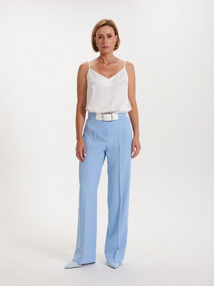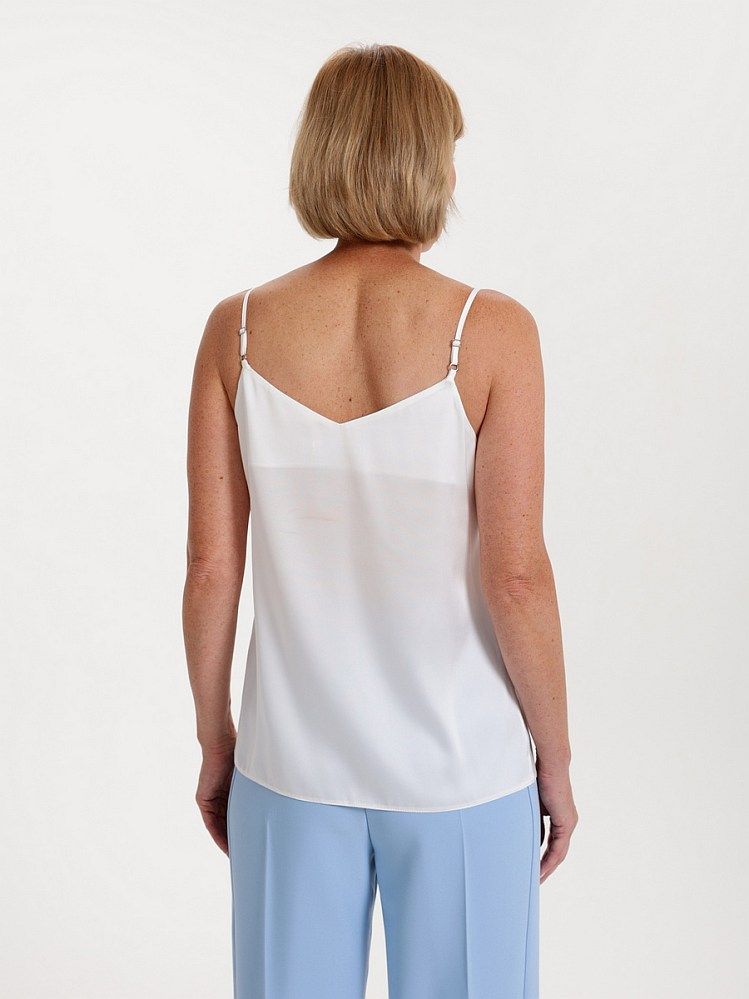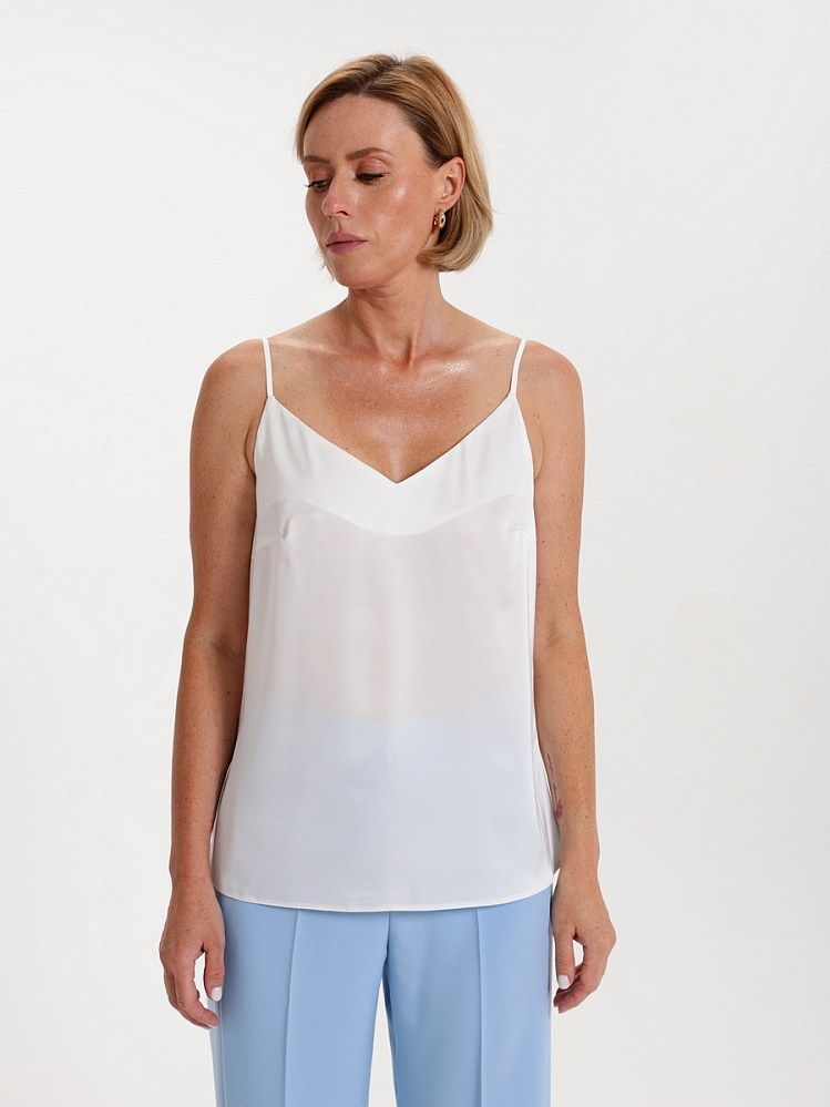 Базовый топ белого цвета из шелковистой ткани атласного переплетения. Самая незаменимая позиция в гардеробе, которая поможет Вам легко скомбинировать любой образ.