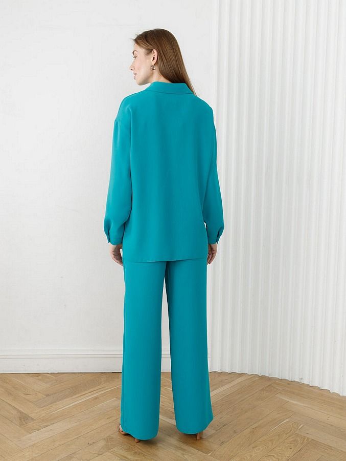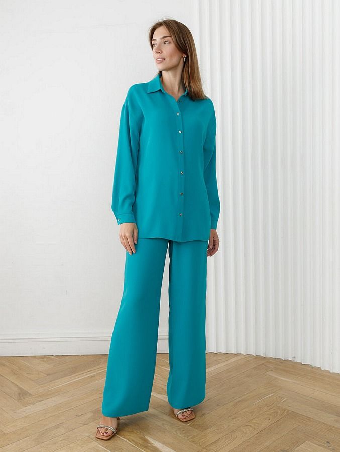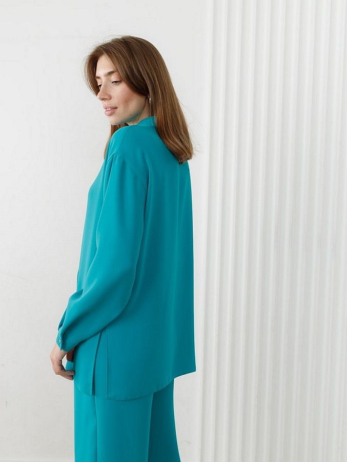 Рубашка из мягкого пластичного крепа. Свободный прямой силуэт. Рубашечный воротник на стойке. Спущенное плечо. По низу рукавов манжеты. Застёжка по центру на пуговицы. Разрезы по бокам. Составляет комплект с брюками 2.5.2-69.1.
