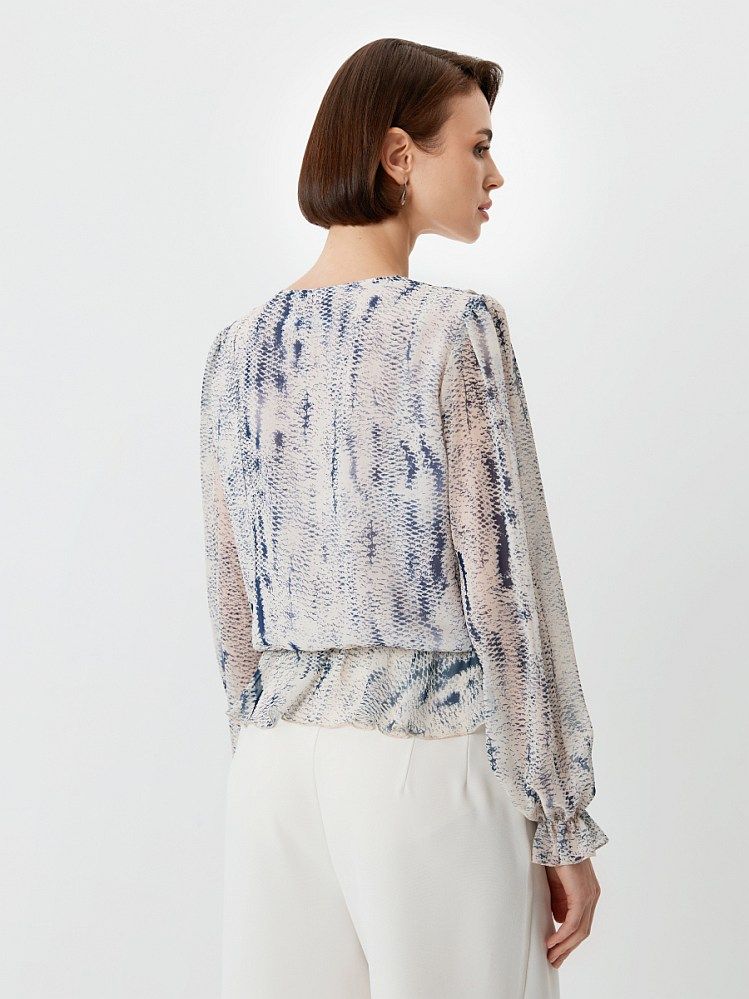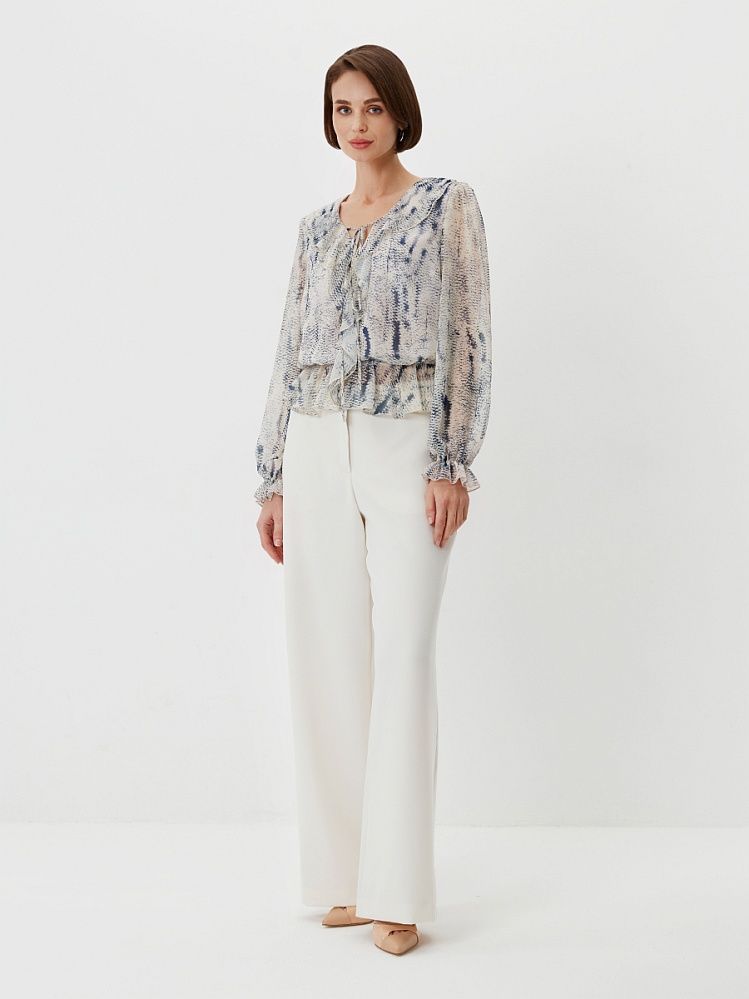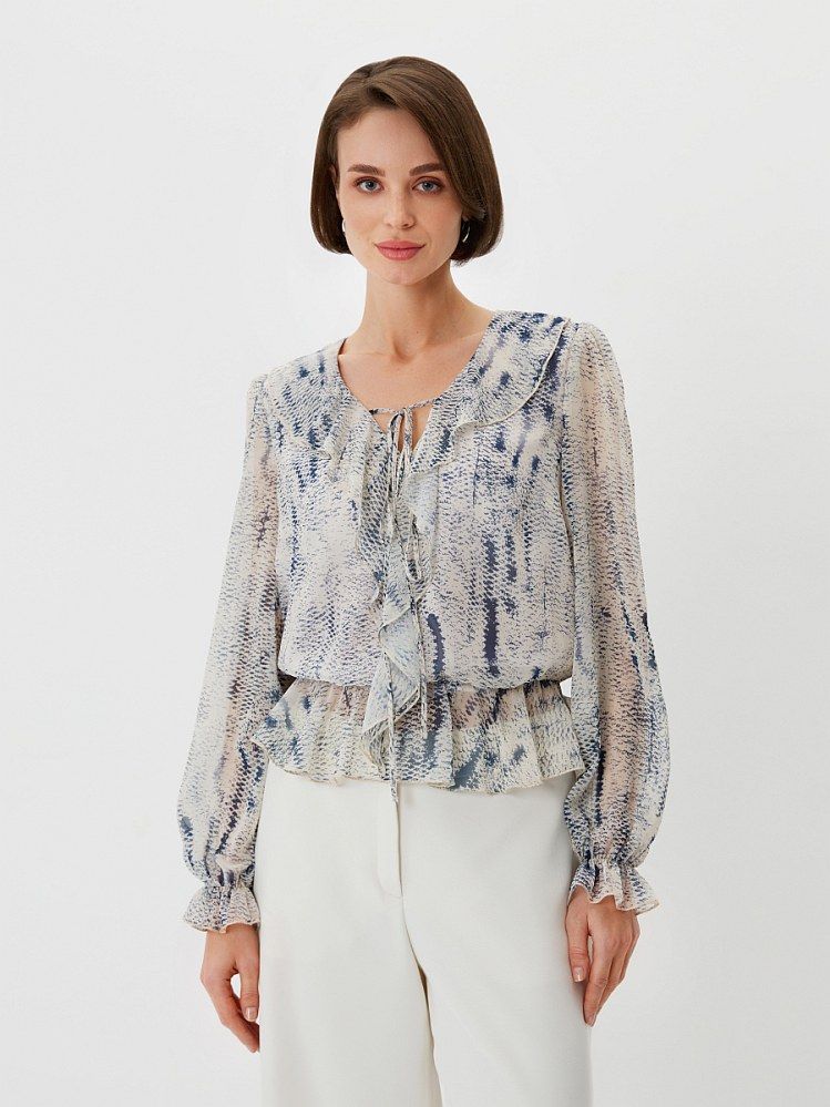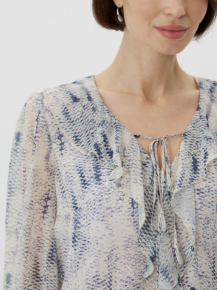 Романтичная блуза из воздушного шифона с деликатным принтом в молочно-синем тоне. Модель прямого силуэта с V-образным вырезом, оформленным изящным воланом . Этот изысканный элемент придаёт образу роскошь и выразительность. Аналогичный декоративный приём использован и на рукавах, усиливая эффект утончённой элегантности. Кокетливая завязка в районе декольте добавляет шарма и позволяет многофункционально декорировать блузу по Вашему вкусу. Эта блуза станет незаменимой частью гардероба, добавляя нотки романтики и утончённости в любой образ.