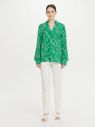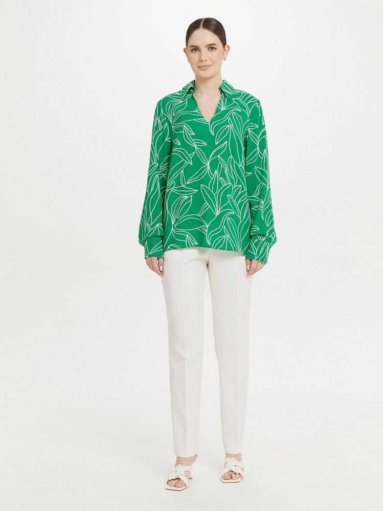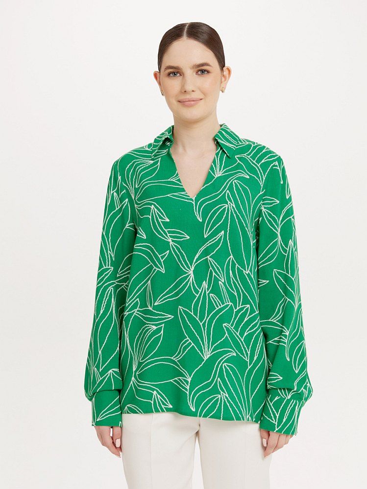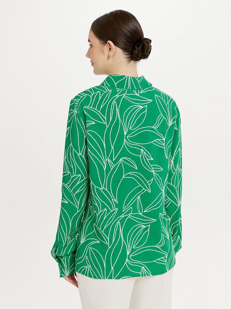 Рубашка из комфортной ткани с элегантным принтом на изумрудном фоне силуэты листвы. Отложной воротник и V-образный вырез, декорированный заваязками. Втачные рукава полной длины на манжетах.