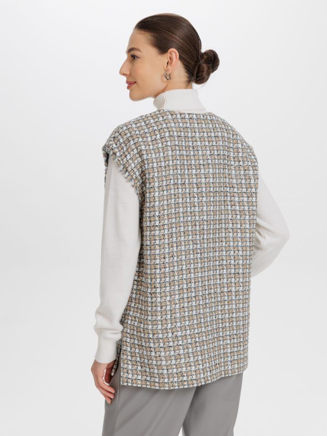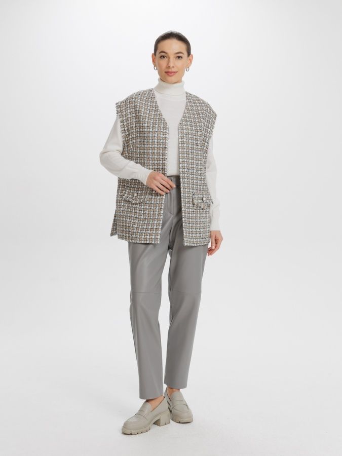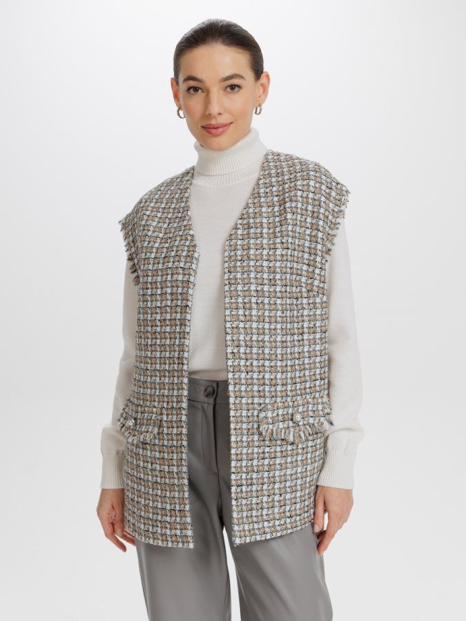 Жилет из ткани "шанель". Прямой силуэт. V-образный вырез. . Длина ниже линии бёдер. Декоративные клапаны.