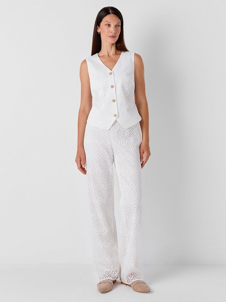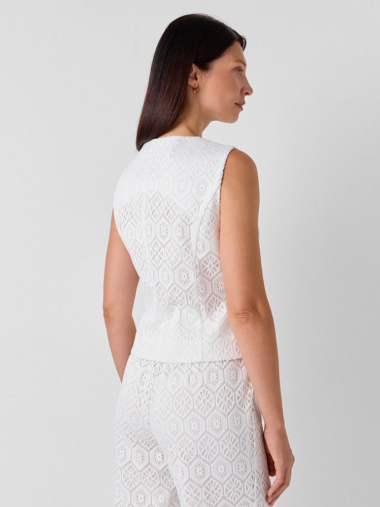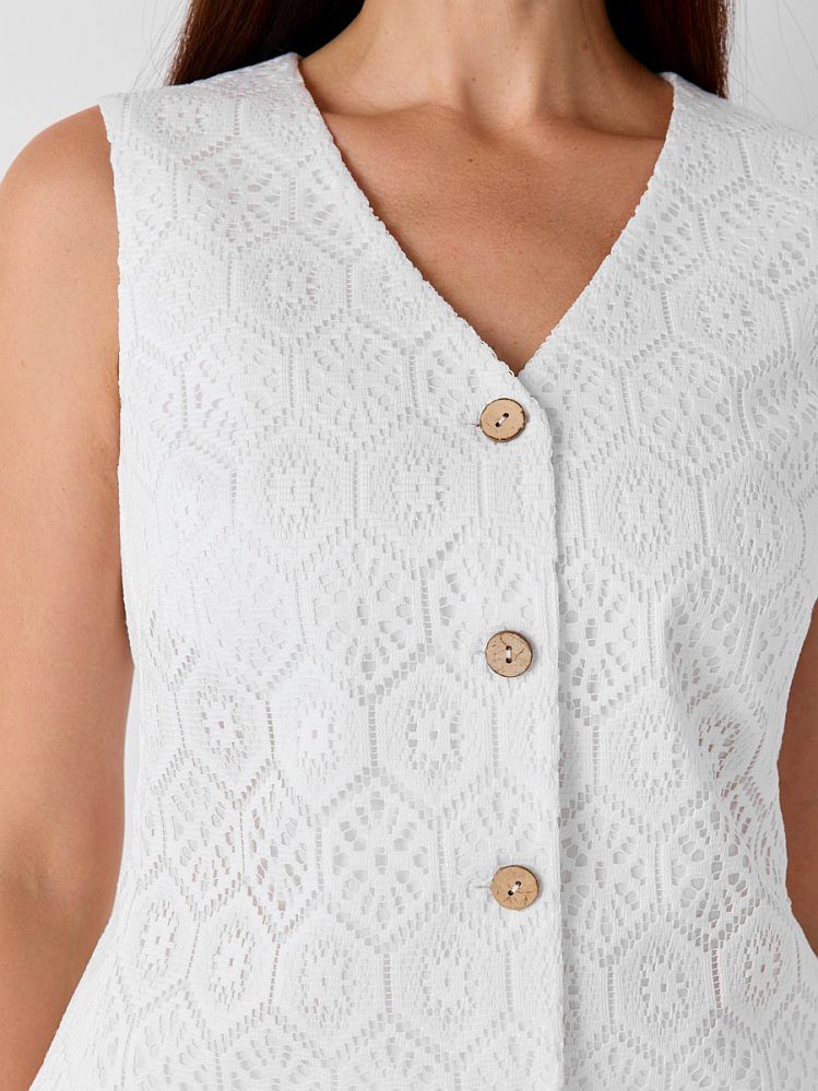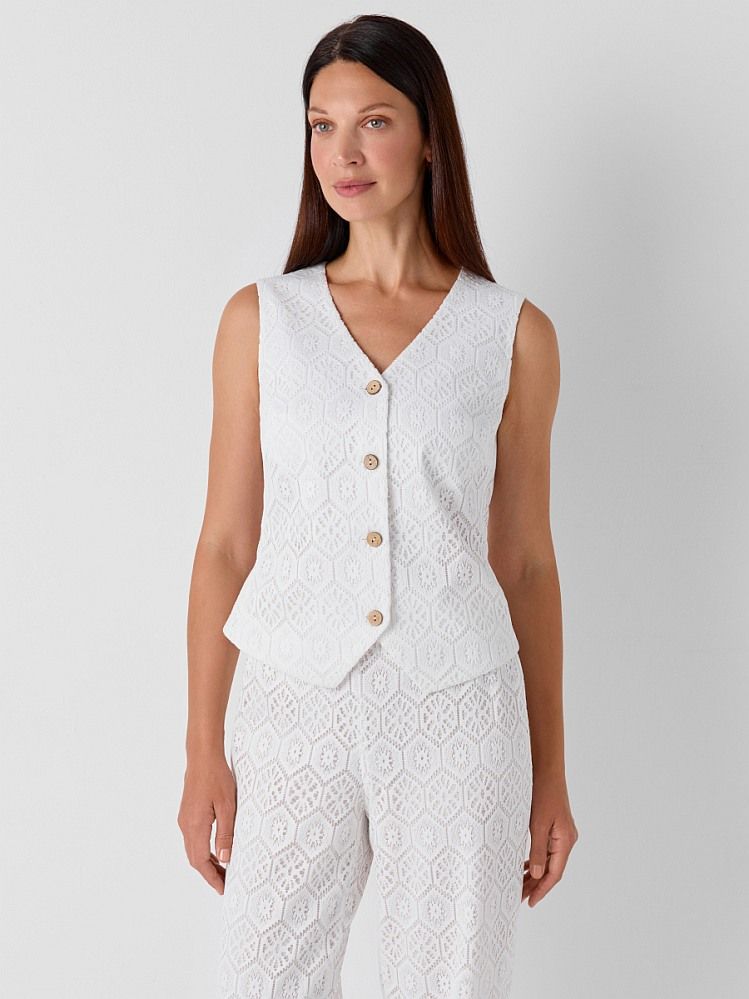 Жилет из смессового хлопкового кружева с геометрическим орнаментом. Модель приталенного силуэта с рельефными швами, подчеркивающими изгибы фигуры и нагрудными вытачками для идеальной посадки. Жилет выполнен на тонком нежном подкладе из натурального хлопка с застежкой на пуговицы из натурального кокоса. Изделие можно комплектовать брюками из той же ткани 2.5.2-284, либо сочетать с классическими брюками 2.5.2-222 и жакетом 2.3.2-94 для создания делового летнего образа.