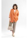 Жакет прямого силуэта без подкладки с застежкой на одну петлю и пуговицу. Рукав на базе спущенного, по низу декорирован отделочной тесьмой. На полочках карманы в рельефах. На спинке высокая шлица. Длина спинки по среднему шву - 78 см , длина рукава от горловины - 67 см.