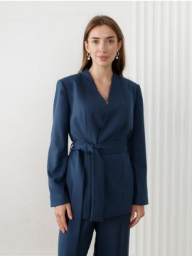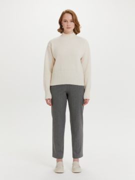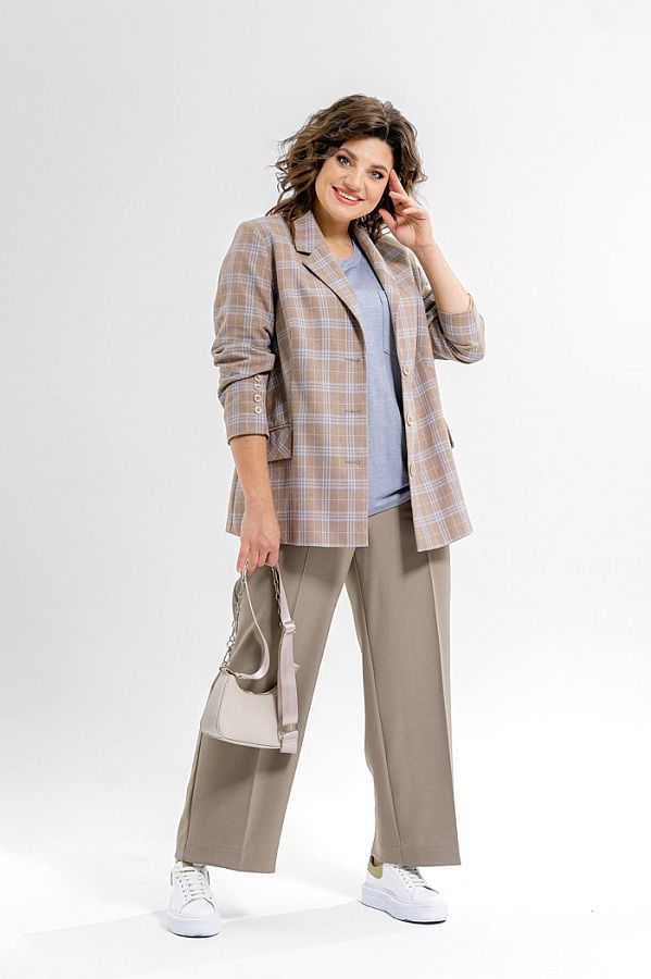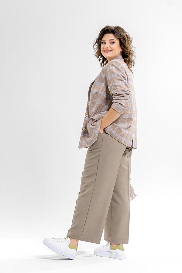 Брюки свободного покроя, прямые от бедра. В боковых швах карманы с отрезным бочком. Пояс отрезной с эластичной тесьмой, застежка на молнию и петлю с пуговицей.