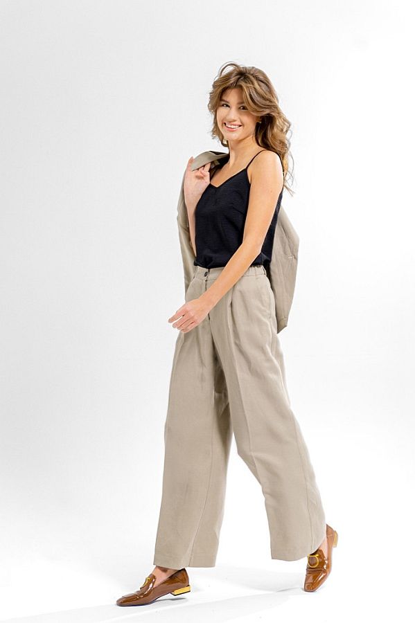 Брюки свободного покроя, прямые от бедра. Застежка на молнию и петлю с пуговицей.