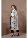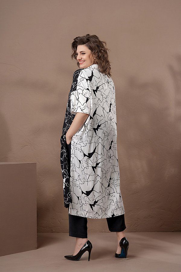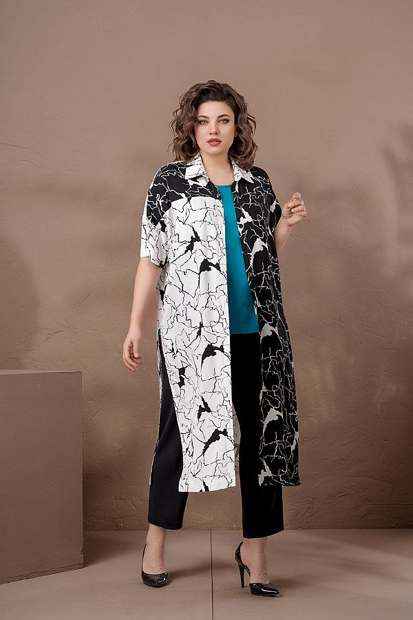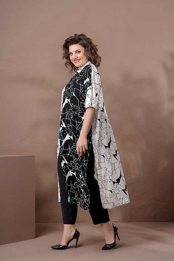 Туника свободного покроя из легкой вискозной ткани двух цветов. Вырез горловины оформлен отложным воротником рубашечного типа с отрезной стойкой. Застежка - на петли с пуговицами. Рукава- отрезные на базе спущенного. В боковых швах высокие разрезы.
