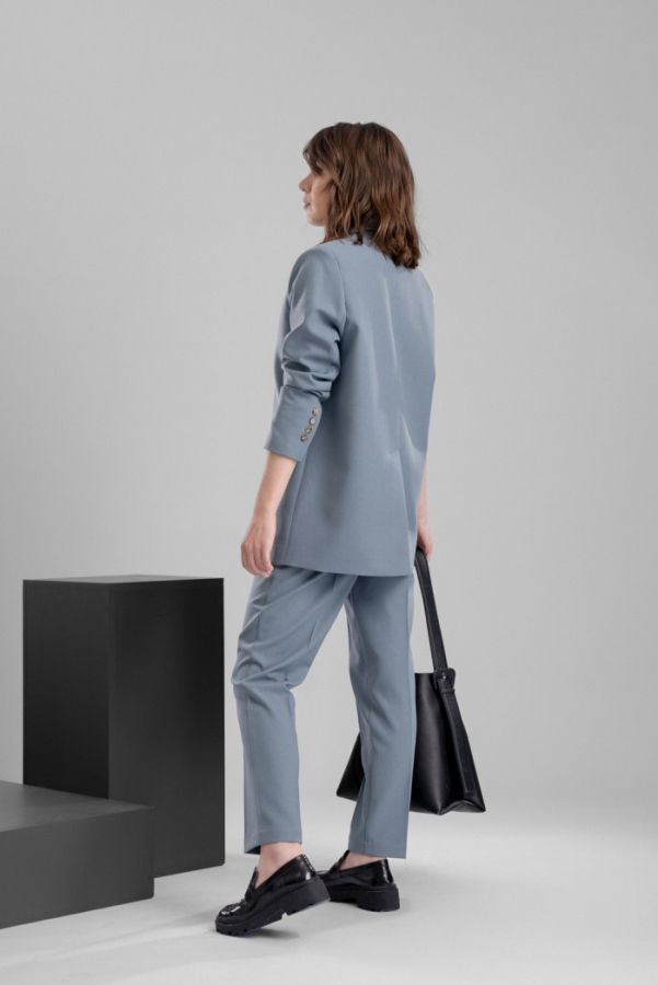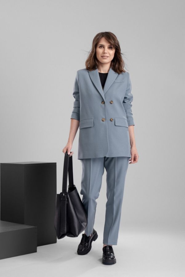 Жакет прямой, на подкладке, однобортный с имитацией двубортного, застежка на петли и пуговицы. По переду прорезные карманы в рамку с клапанами, по спинке шлица. Рукав втачной двушовный с шлицей.