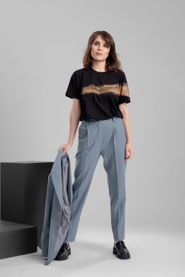 Брюки классические слегка зауженные к низу, в боковых швах карманы с отрезным бочком. Застежка на молнию и петлю с пуговицей. Пояс отрезной с эластичной тесьмой.