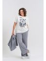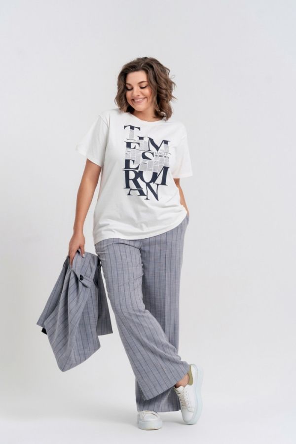 Блуза свободного покроя со спущенным рукавом. Вырез горловины- неглубокий округлой формы с отрезной планкой. Перед декарирован печатью.