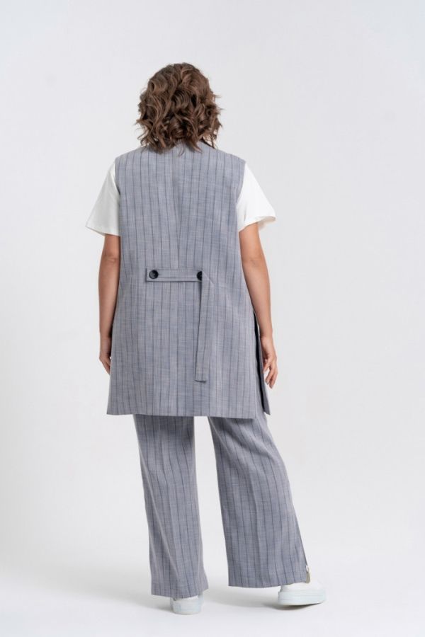 Жилет на подкладке, с высокими разрезами в боковых швах. Без воротника, с застежкой на петлю и пуговицу. На спинке съемный хлястик.