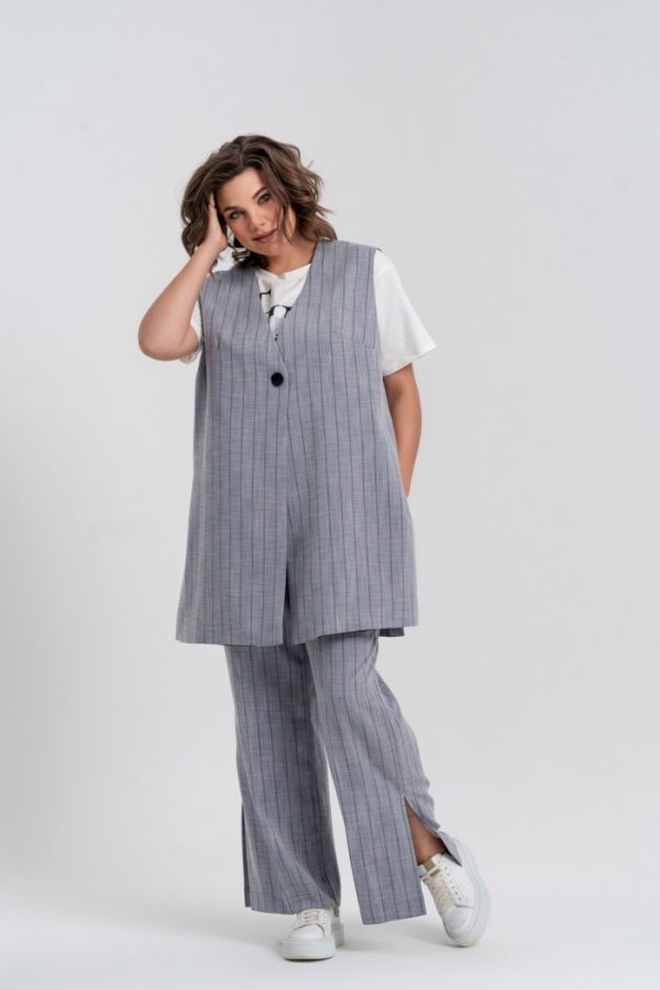 Материал: Жилет и брюки: Вискоза -55%, ПЭ-42%, спандекс-3%; Блуза: Хлопок-97%, спандекс - 3%