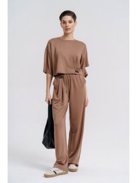 Брюки свободного покроя, широкие. В боковых швах - карманы с отрезными бочками. Пояс - отрезной с эластичной тесьмой и кулисой.