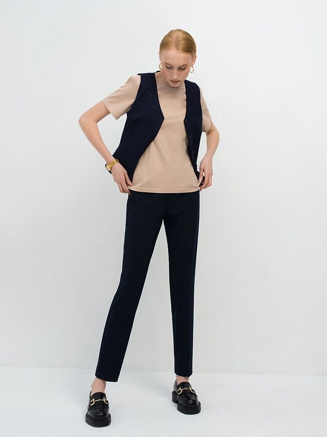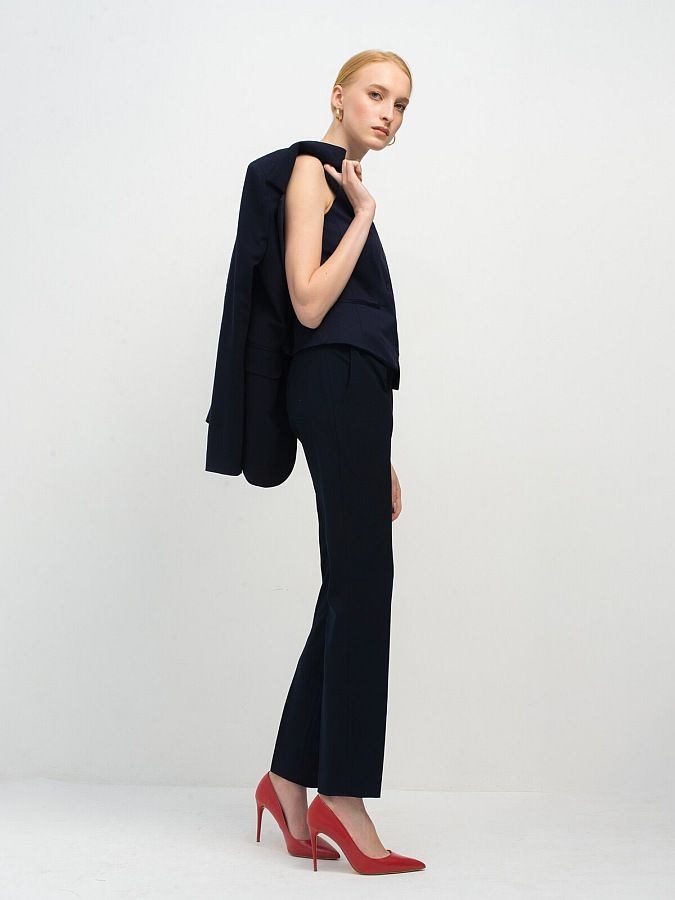 Детали | Средняя посадка. На передних половинках защип и карманы с отрезным бочком. Застежка-гульфик на молнию и крючок. Пояс шириной 3.5 см.
